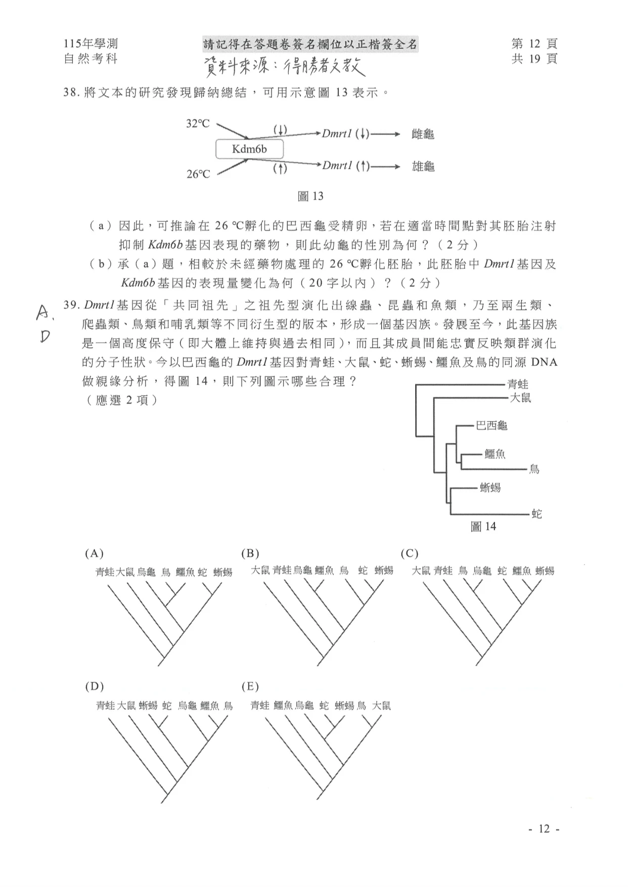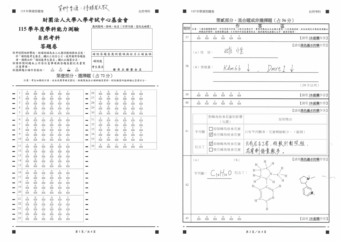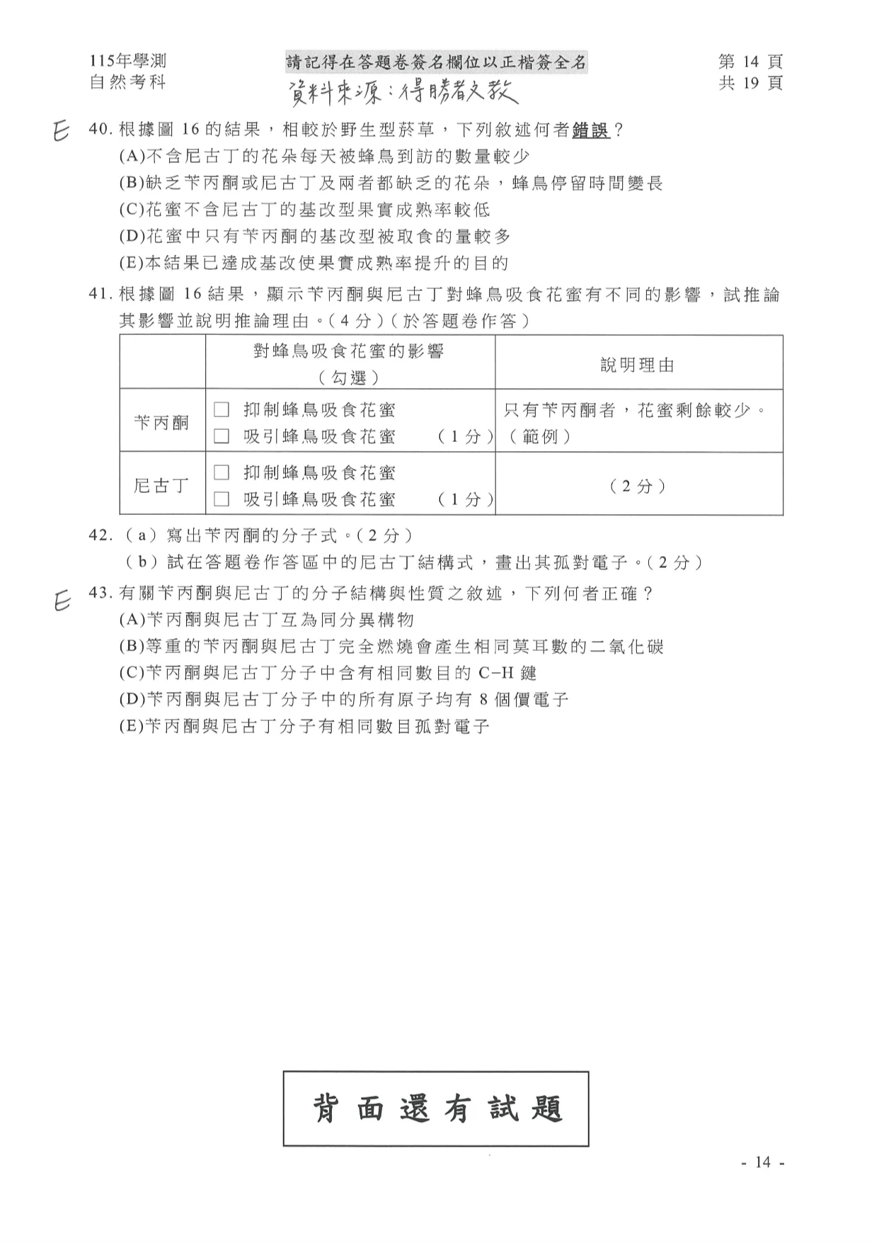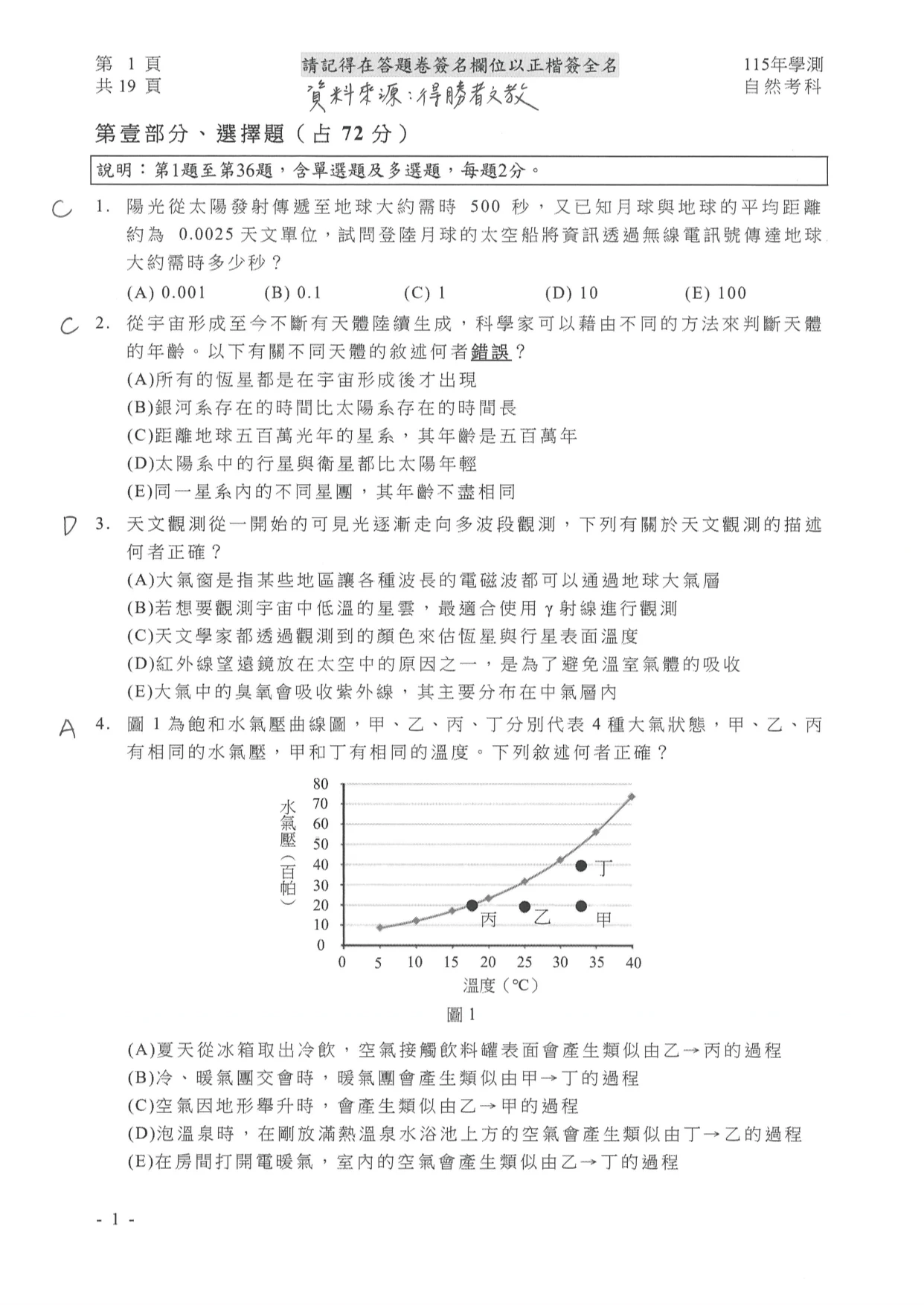 學測自然參考解答如下: