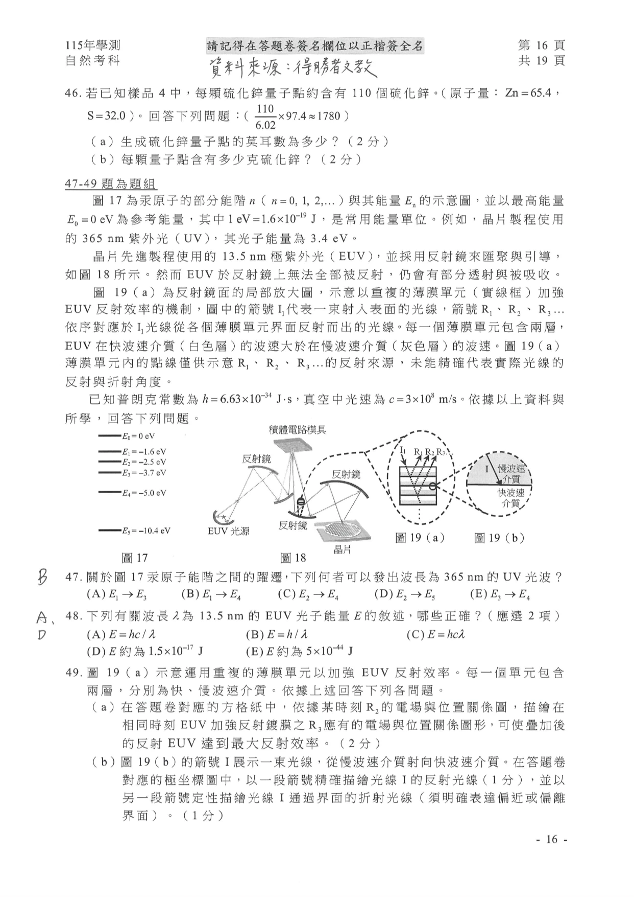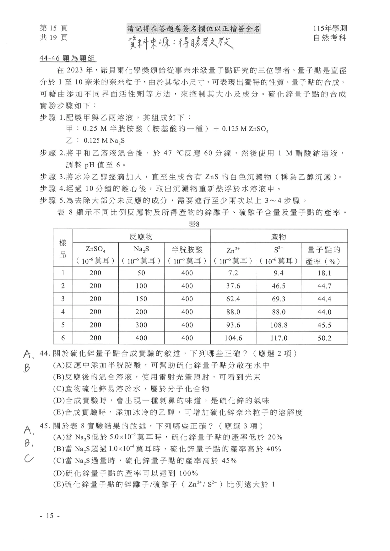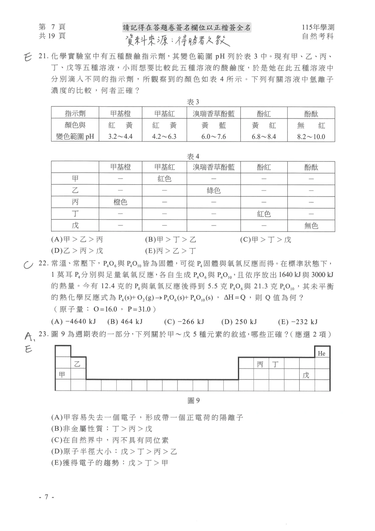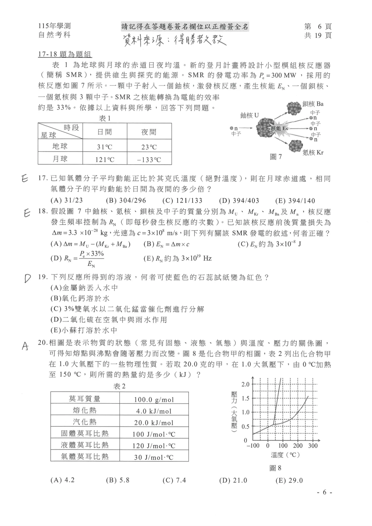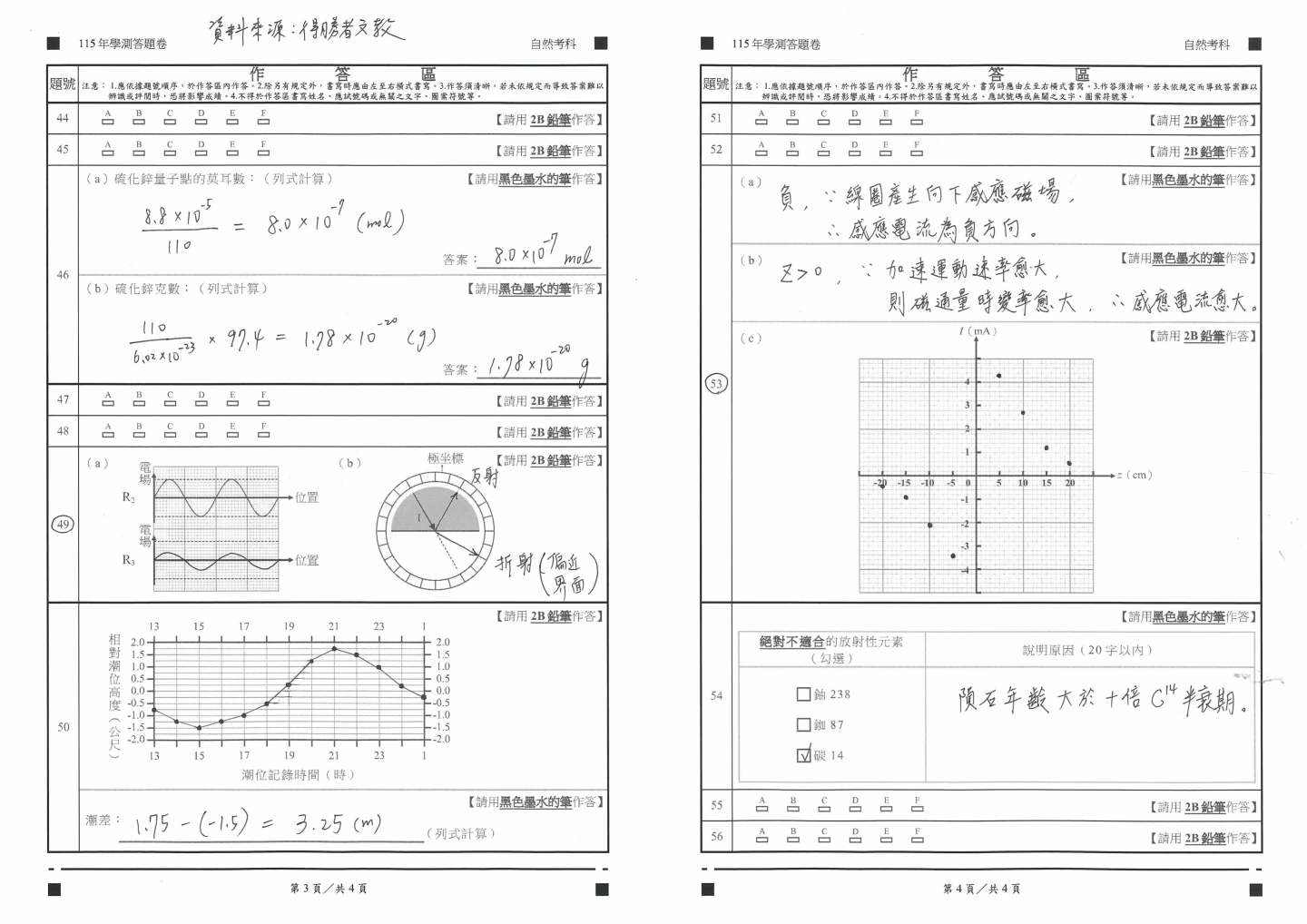 學測自然參考解答如下: