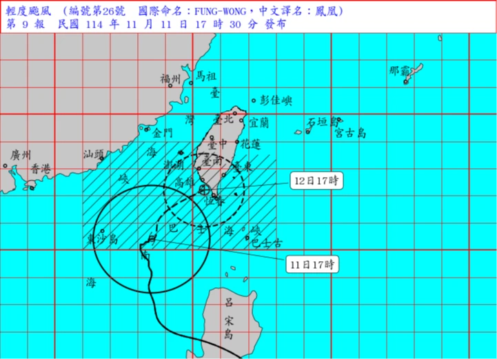 輕度颱風鳳凰(國際命名FUNG-WONG)17時的中心位置在北緯20.4度,東經118.5度,即在鵝鑾鼻的西南方約300公里處。