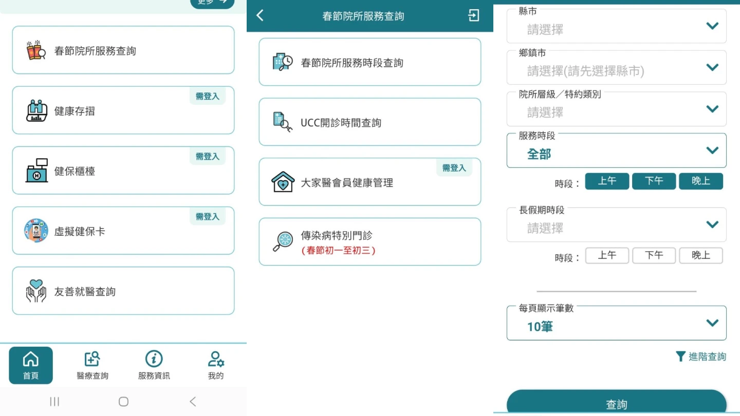 為了方便民眾查詢有開診的醫療院所,健保署今年特別在官網和「健保快易通」App建立「春節院所服務查詢」專區,民眾點選縣市、鄉鎮市、醫院或基層醫療單位(診所)、服務時間、長假時段,選完按下查詢即可看到有開診的醫療院所清單,點進去個別診所往下拉,還可看到該間診所在春節連假期間每天的開診狀況。