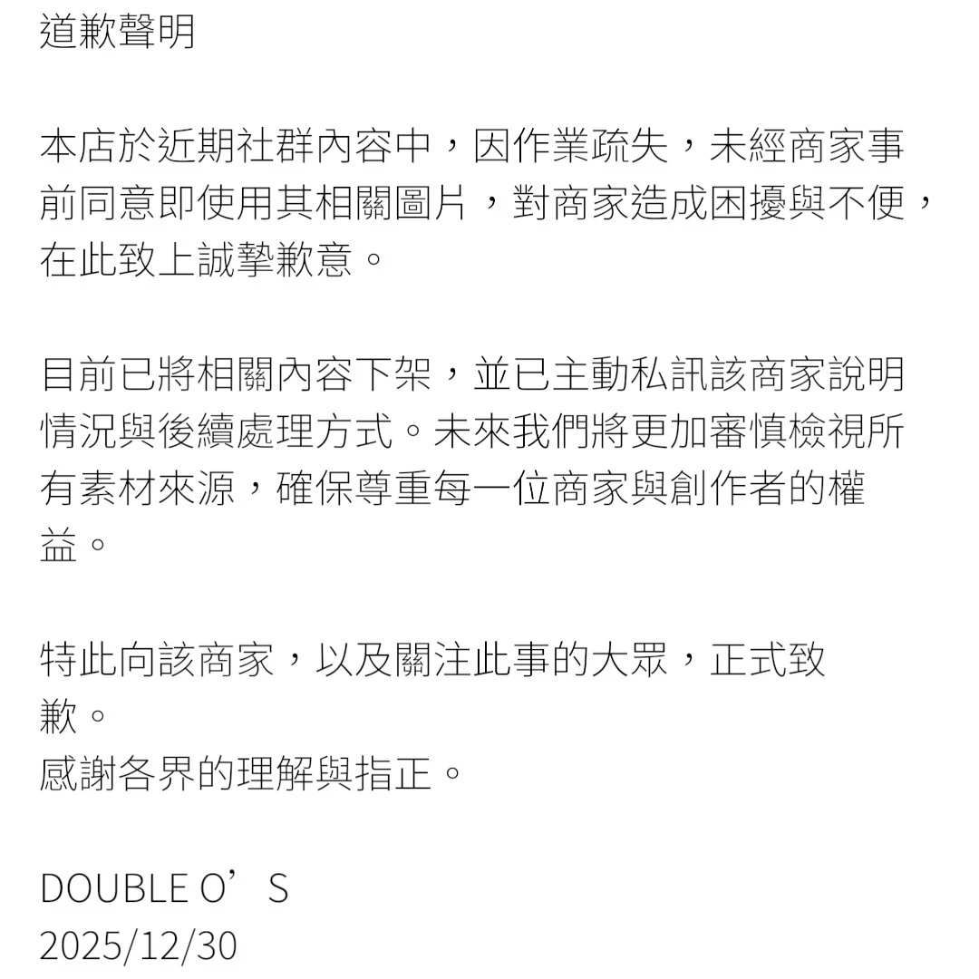 「DOUBLE O'S」並發出道歉聲明,針對此事進行說明。「本店於近期社群內容中,因作業疏失,未經商家事前同意即使用其相關圖片,對商家造成困擾與不便,在此致上誠摯歉意。」