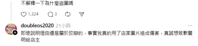 至於有網友質疑為何不解釋盜圖原因,店家回應「即使說明理由還是屬於狡辯的,事實我真的用了店家圖片造成傷害,真誠想致歉聲明給店主。」