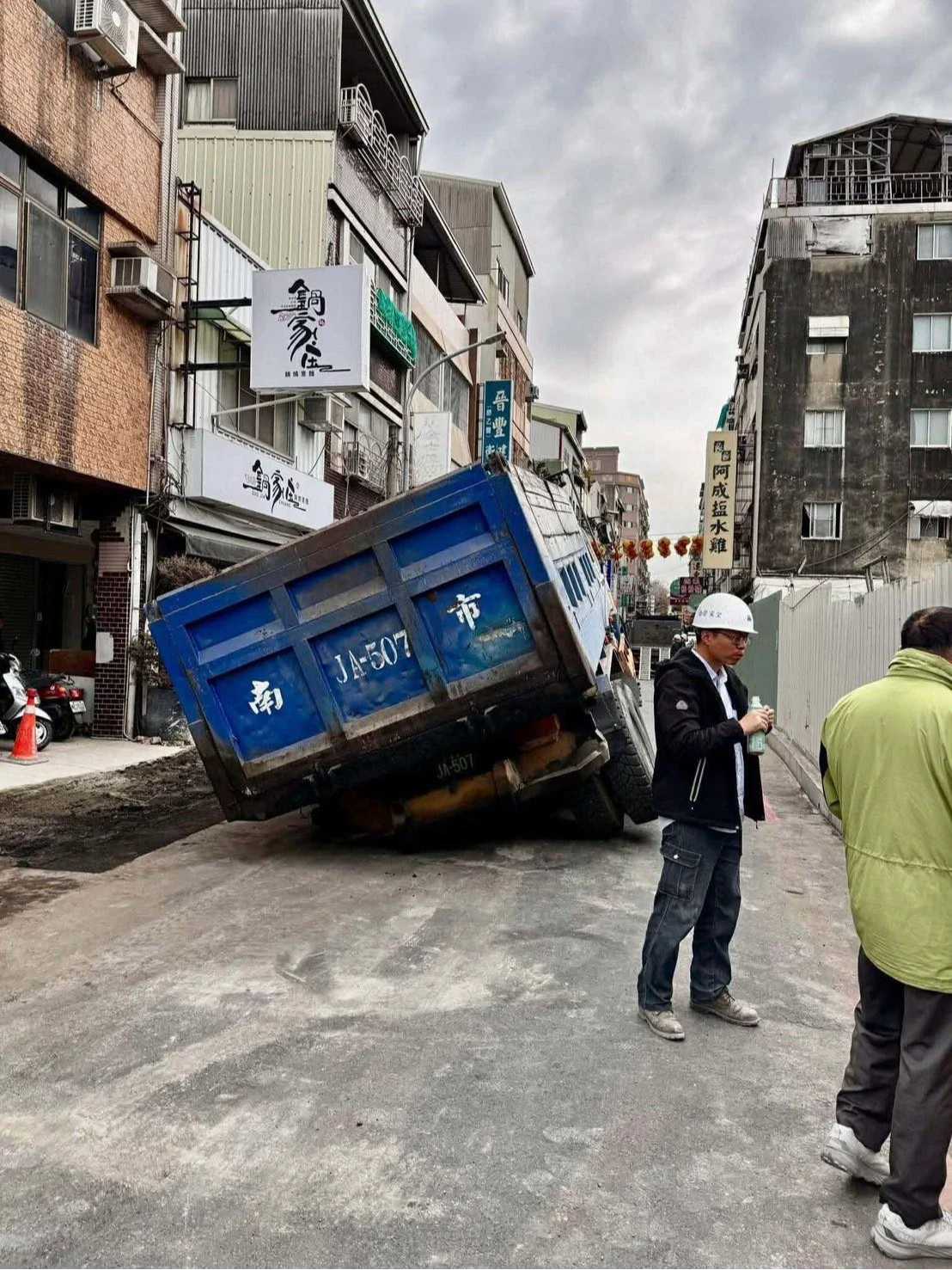 不過,昨晚才補好的地面,今天上午再度發生坍陷狀況!一輛砂石車行經此處,未注意路面天坑,輪胎整個被卡住,動彈不得。