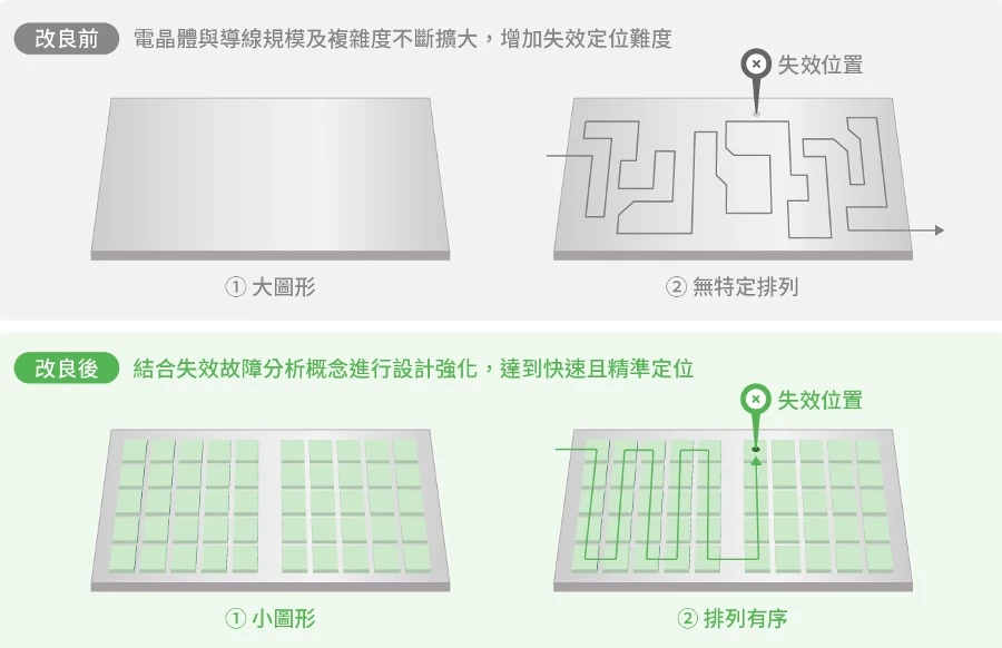 為提高處理效率,台積電採用設計強化策略,結合失效故障分析的概念,對測試電路進行全面優化。在符合測試項目的前提下,將原本電路圖中無序排列的大圖形,轉換為排列有序的小圖形,以達到快速且精準的失效定位;除於實驗室端應用外,亦同時部署至製造端,使產線上也能進行偵測與失效分析作業,增進生產效能及產品品質。