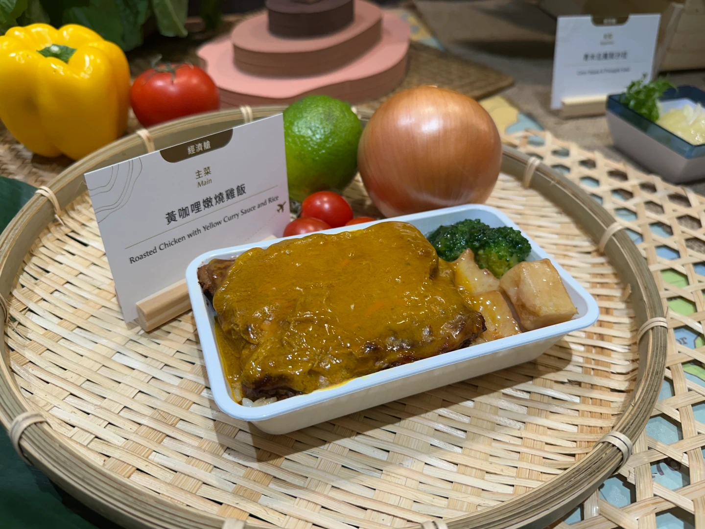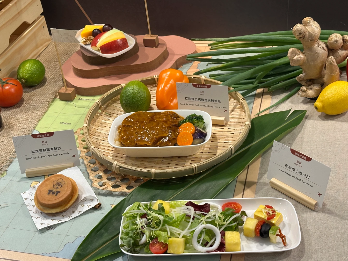 經濟艙主菜「黃咖哩嫩燒雞飯」,以特製的雞油飯,搭配燉煮的雞肉與黃咖哩,帶給旅客跨文化旅行感的風味;而「青木瓜鳳梨沙拉」以酸、甜、脆的口感開啟味蕾,醬包有椰糖、檸檬、魚露三種泰式風味,讓旅客依個人喜好自由調整酸甜鹹的口味,展現華航餐飲的創新服務。