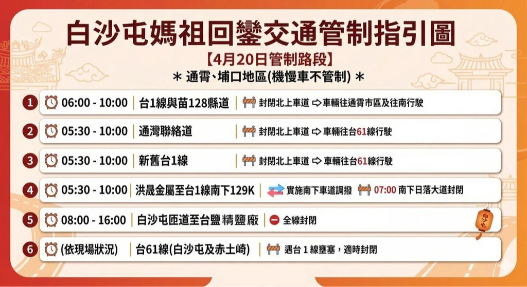 4月19日管制重點:自上午8時起,台1線苑裡、通霄路段將陸續封閉或實施調撥車道;警方亦會視現場車流與人潮情況,於台61線(西濱快速道路)通灣聯絡道、新埔及白沙屯匝道口實施彈性封閉管制。