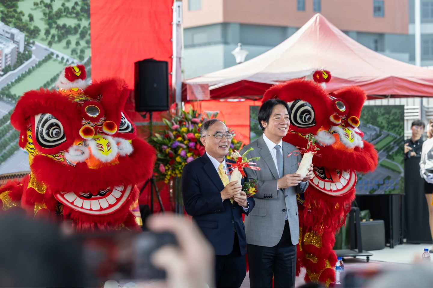 賴清德也感謝劉建國從2019年起,持續協助中央與地方溝通協調,劉當時跟時任總統蔡英文報告、也跟時任行政院長的自己提到此項重大建設,自己毫不猶豫支持,「不曉得是不是劉建國的手段(台),先講60億,後來變70幾億、90億、111億,現在到129億」,台下聽聞哄笑,賴強調,不過中央一定全力支持。