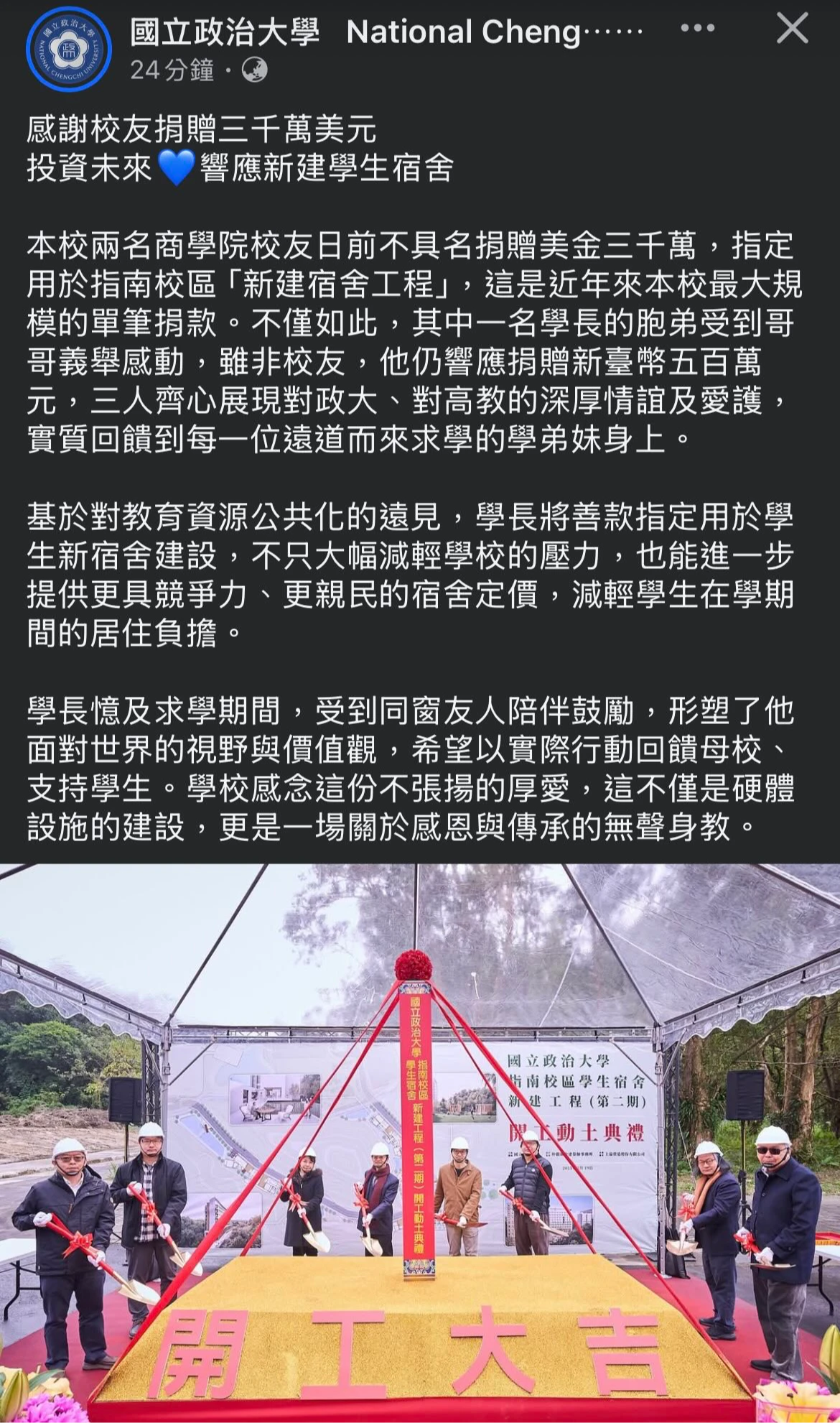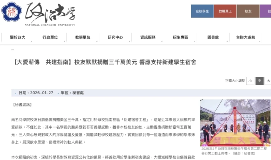 【記者陳力維/綜合報導】國立政治大學(NCCU)近日傳出驚人校友回饋消息!兩名商學院校友不具名捐贈高達3000萬美元(約新台幣9.7億元),並特別指定用於「新建宿舍工程」。此外,其中一名校友的胞弟雖非政大校友,也加碼捐贈500萬台幣,這項消息在社群平台上引發熱議。由於去年8月政大宿舍才因設備老舊、壁癌嚴重遭炎上,許多網友紛紛戲稱這是「破宿舍有助於激勵人向上,未來捐給學校」的正面效果,認為是當年住宿設備太爛,才激勵校友發憤圖強,如今回饋母校改善學弟妹居住環境。