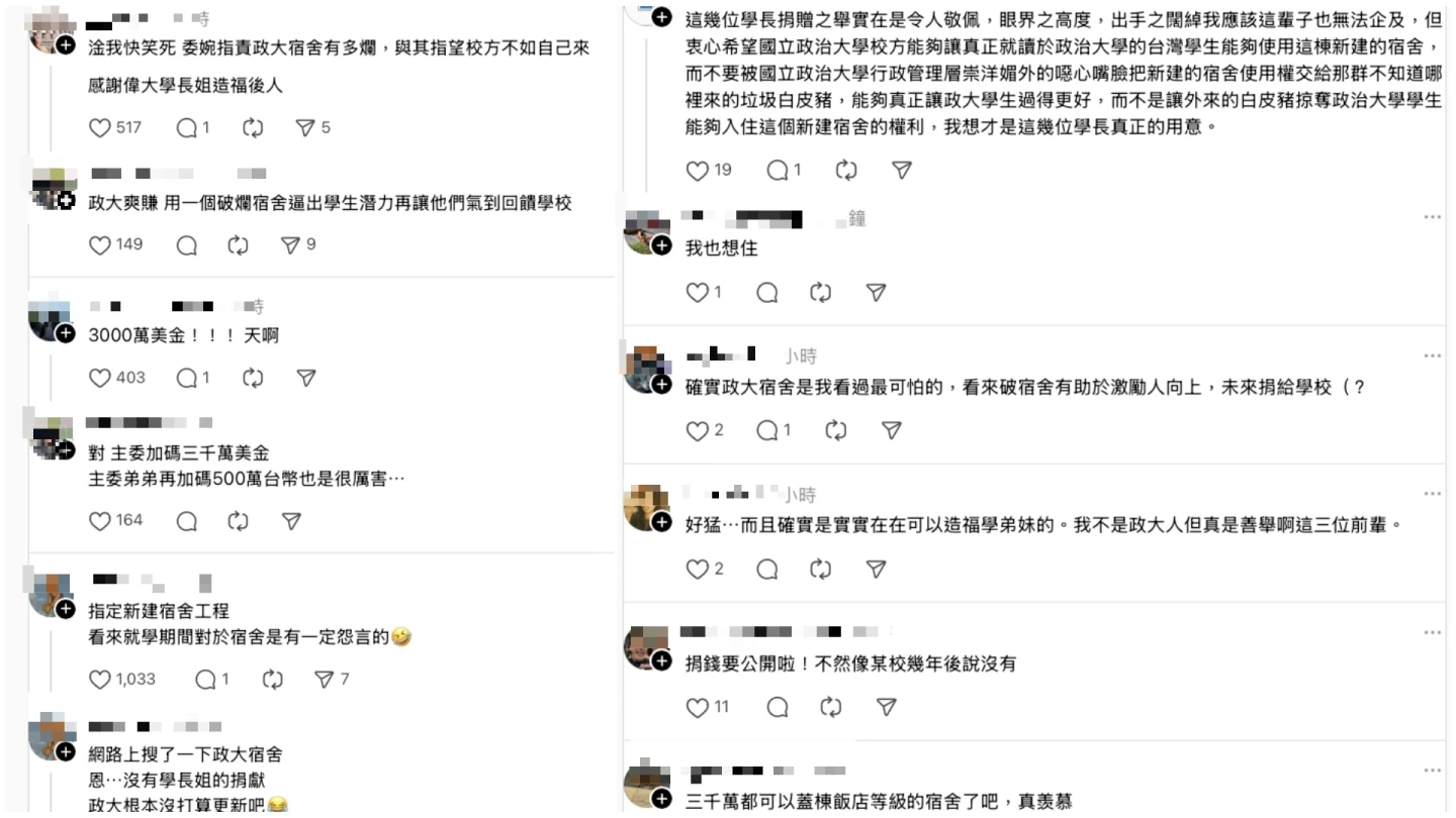 這則消息疑似一度在政大臉書粉絲專頁發布,後來卻消失,引發網友猜測,但相關文章截圖已在社群Threads上引起熱烈討論。許多網友聯想到先前政大宿舍的惡劣環境,紛紛發揮創意留言。有網友笑稱:「委婉指責政大宿舍有多爛,與其指望校方不如自己來」、「政大爽賺,用一個破爛宿舍逼出學生潛力,再讓他們氣到回饋學校」。還有人幽默表示:「指定新建宿舍工程,看來就學期間對於宿舍是有一定怨言的」、「這幾位學長捐贈之舉令人敬佩,希望校方不要辜負」。