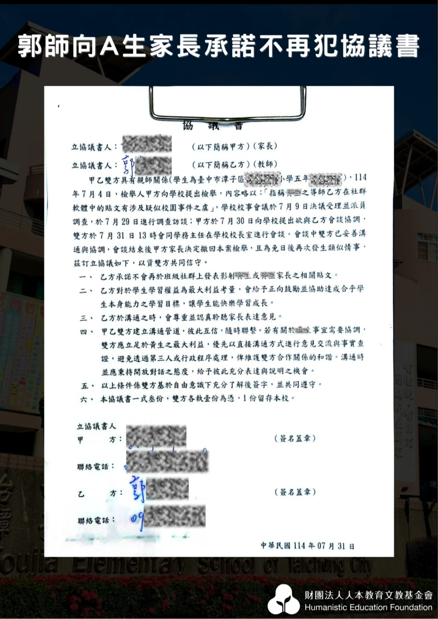 人本中辦主任曾芳苑表示,A生與家長在五年級下學期首次向校方檢舉,經校方協調達成和解,郭師並於協議書中承諾不再影射學生及家長,並以學生學習權益為最大考量。然而A生升上六年級後,郭師情緒失控與公開羞辱行為不減反增,家長近日提出第二次檢舉後,校事會議決議暫時將郭師調離導師職務。