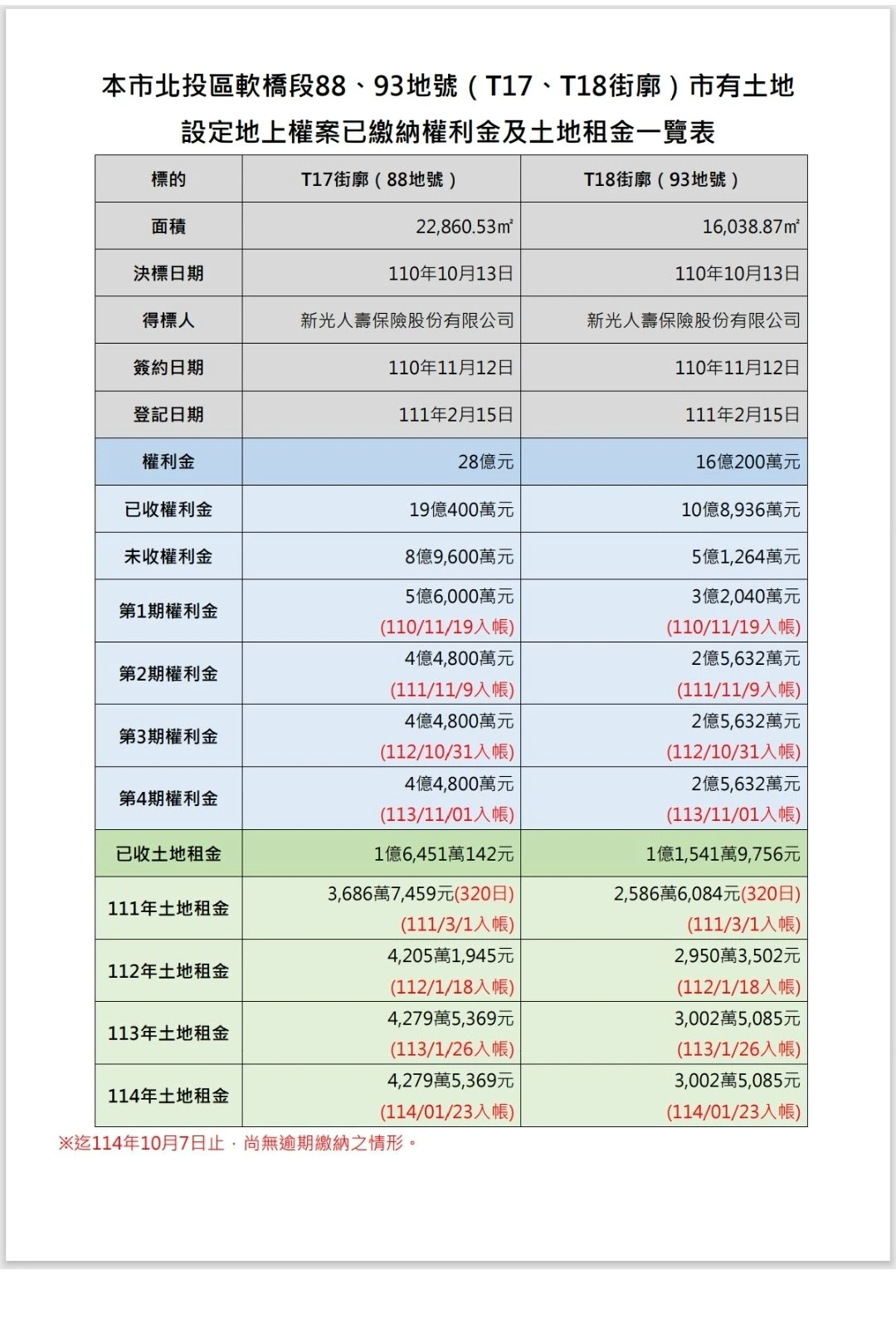 根據市府資料,新壽在北投軟橋段T17與T18街廓的地上權案,截至目前繳交給北市府為實繳權利金29.9328億,已繳土地租金2.799億(111到114年),目前新壽繳給北市府總金額兩者合計約32.73億元(尚有約14.1億權利金未繳),之前傳出若合意解約,新壽提出需補償140億元,金額是新壽至今實付金額的4倍以上。