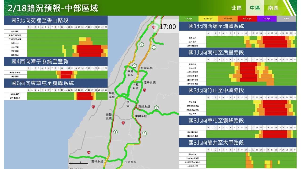 高公局建議西部國道南向用路人儘量6時前或12時後出發;國5南向用路人建議5時前或17時後出發,另國5北向用路人建議於9時前出發,節省寶貴時間。
