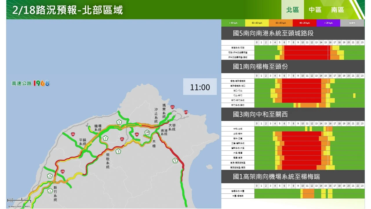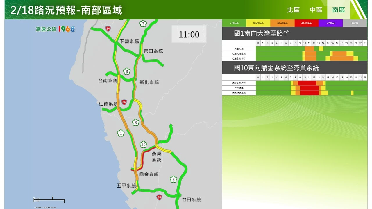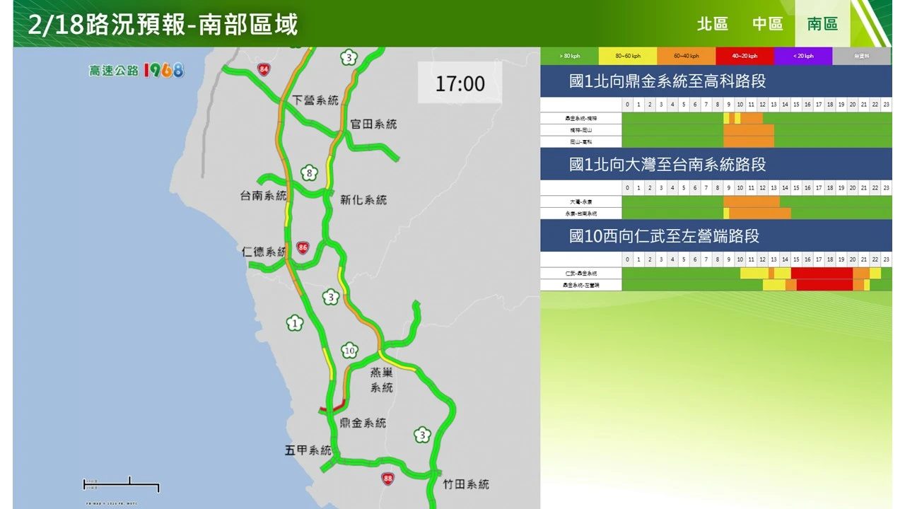 明(18)日為春節連續假期第5天(初二),預估國道交通量為134百萬車公里,為平日年平均(93百萬車公里)的1.4倍,其中南向交通量可達69百萬車公里,為平日年平均的1.5倍。