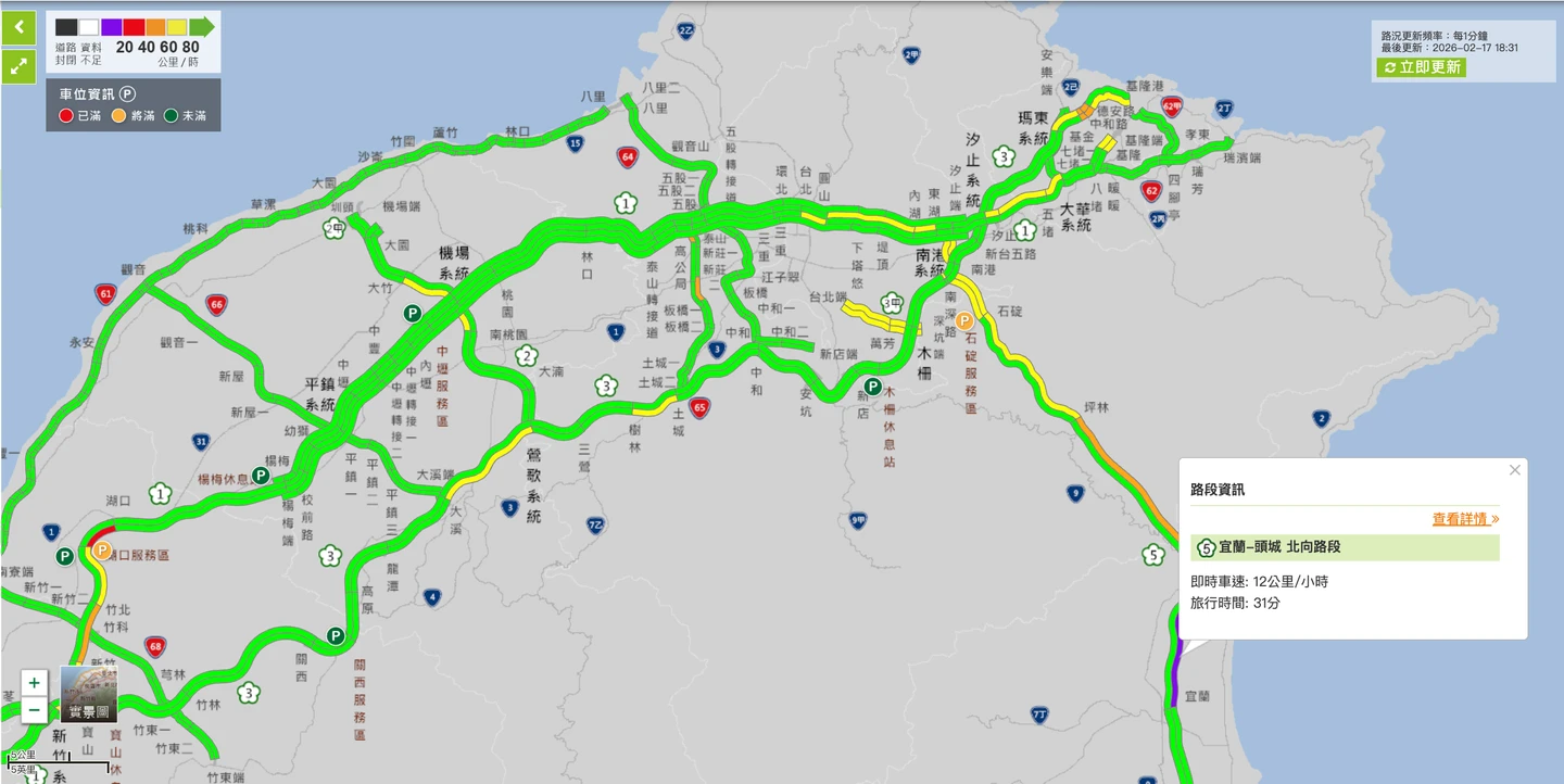 根據高速公路1968即時路況顯示,目前國道5號「宜蘭-頭城北向路段」呈現紫爆,時速僅12公里。截至17時,國道交通量為81.7百萬車公里,預估今日交通量為122百萬車公里。