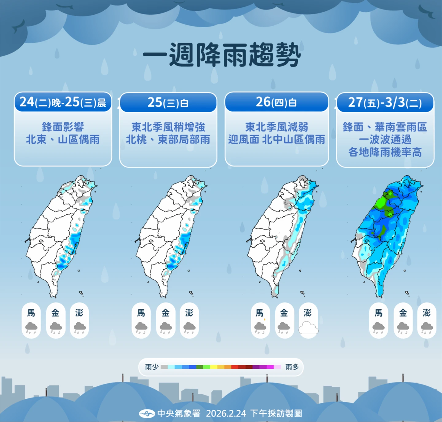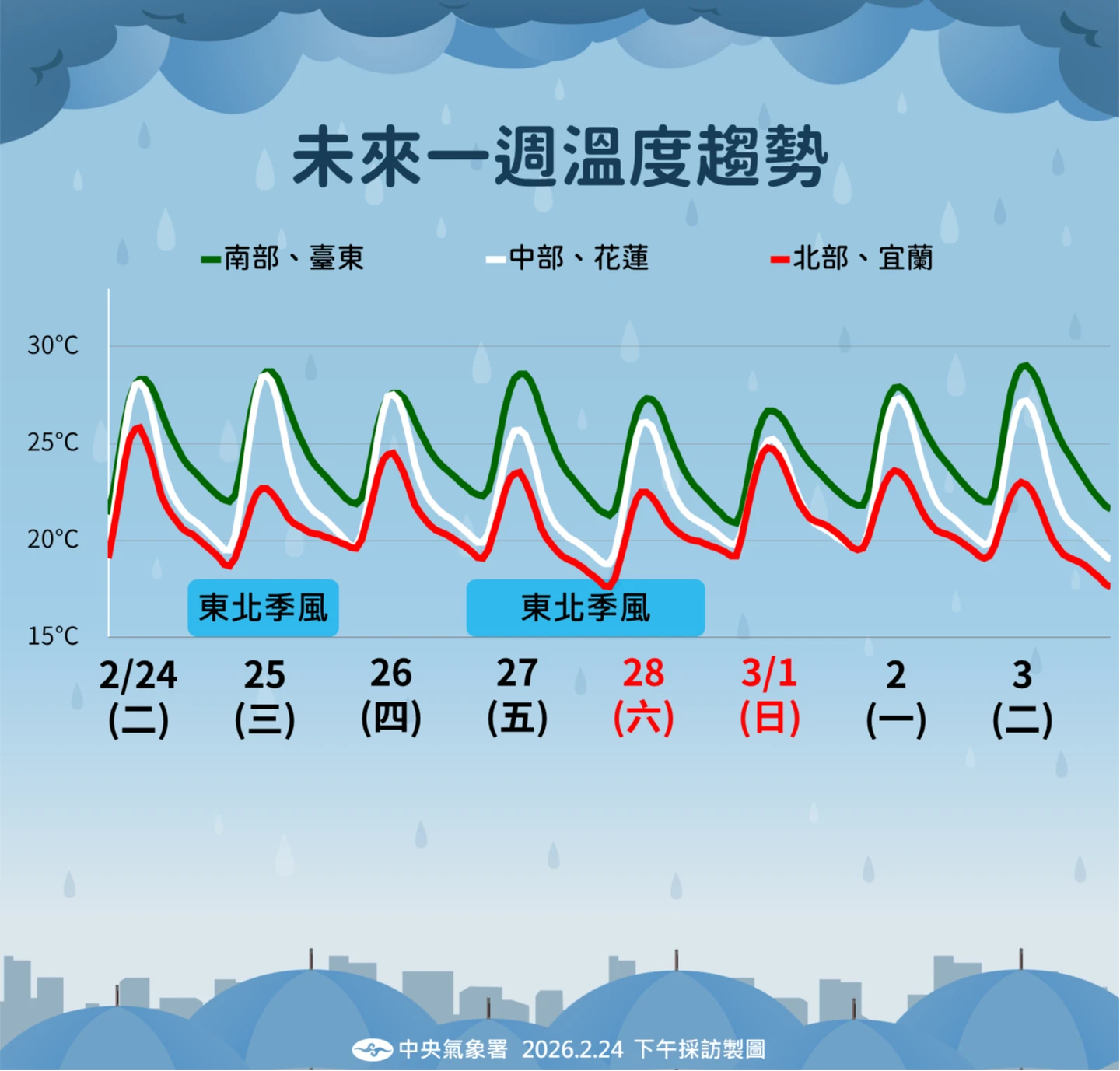 下周日(3/1)至下周一(3/2)東北季風減弱,氣溫回升,但中部以北及東半部仍有局部短暫陣雨;下周二(3/3)另一鋒面再度影響,中部以北與東北部降雨機率提高。