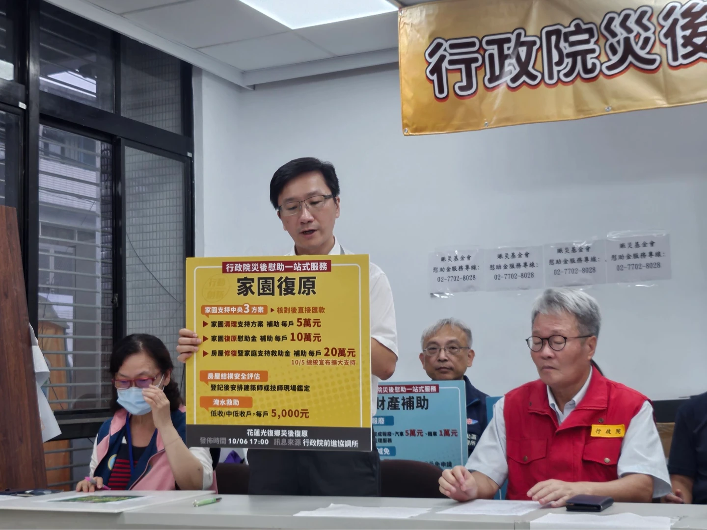 陳金德說明,此次慰助金發放金額是以既有「家園清理支持方案」5萬元、「家園復原慰助金」10萬元,再加上中央提供的「房屋修復慰助金」20萬元,合計每戶35萬元。行政院長卓榮泰指示行政團隊要簡化程序、加速撥款,並要求主動查訪,減少民眾往返排隊等待時間。