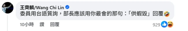 王齊麟的回應意外引起討論,有網友支持「整個黑白教,但我支持」、「對某些立委,真的可以直接用供蝦毀」、「然後手手還要在部長的屁股上拍一下」,但也有人認為這樣太不正式,「這樣會出事啦!」「部長如果因此丟了工作,請記得養他」,還有人打臉王齊麟「你錯失藥檢好像比較嚴重耶」「部長回去有修理你嗎?趕快設鬧鐘辣!不要把我們的部長身體氣壞了…好好按耐你的部長。」