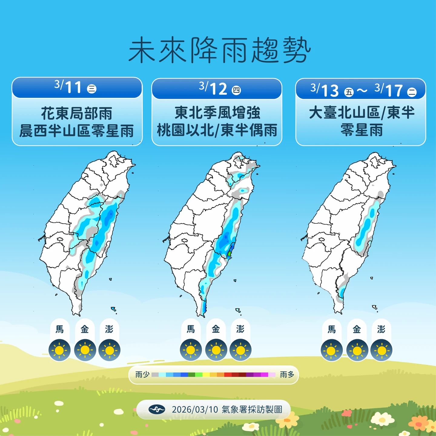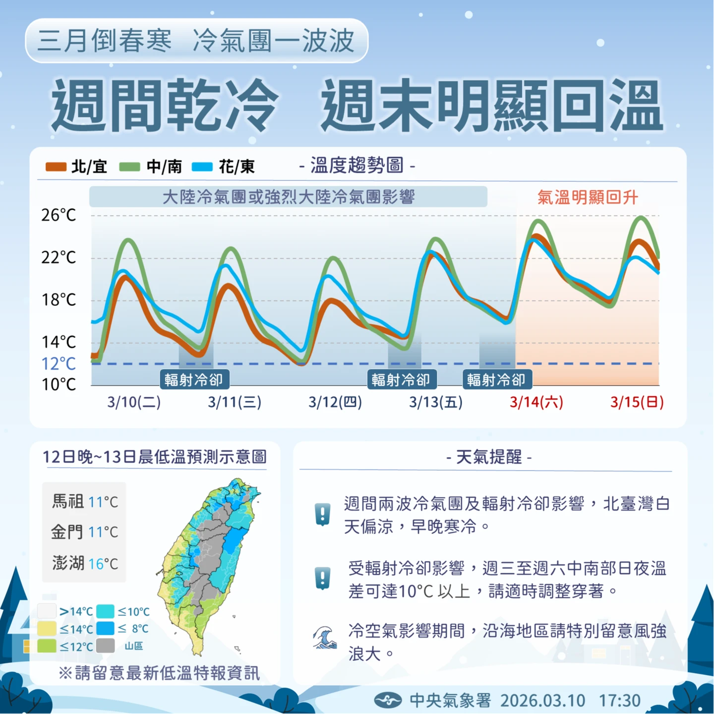 強烈大陸冷氣團,北台灣氣溫下降,其他地區早晚也偏涼;基隆北海岸、大台北、東北部及北部山區有零星短暫雨。周五(13日)至周六(14日)仍受冷空氣與輻射冷卻影響,各地早晚寒冷,但白天逐漸回暖。周日(15日)至下周二(17日)環境轉為偏東風,氣溫逐日回升,各地大致為晴到多雲,僅迎風面地區有零星降雨機會。