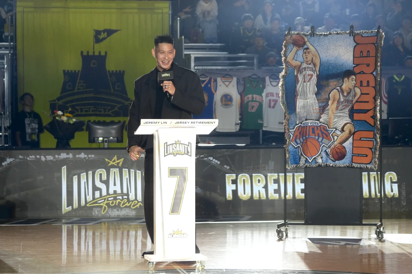 林書豪感謝太太一路支持著她、讓他去愛別人更多,犧牲掉自己不曝光,讓他能做更多事。而在致詞結束後,天王周杰倫驚喜現身,讓林書豪又驚又喜,最後2人一起率領現場滿場球迷倒數7秒,將林書豪的7號球衣緩緩升起。