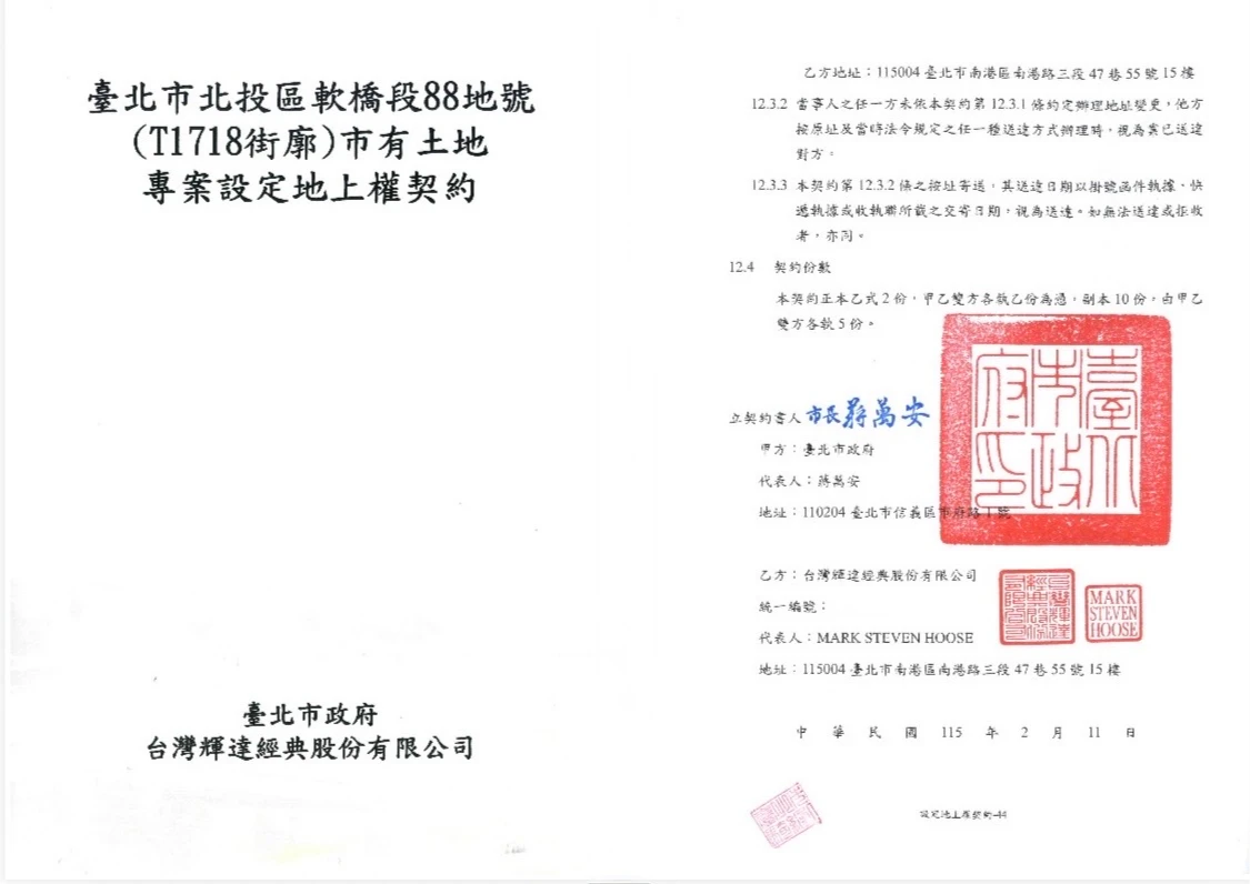 至於簽約形式,蔣萬安進一步說明,基本上今天就是和台灣輝達經典股份有限公司簽約,上午完成換約,有台北市政府的用印和市長名字,輝達簽約代表為輝達全球總稅務長、台灣輝達經典公司法定代表人Mark。