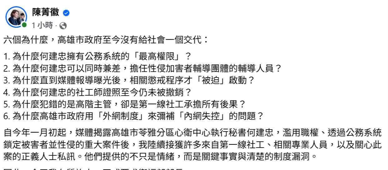【記者王勇超/高雄報導】高雄市衛生局心理衛生中心前執行秘書何建忠涉誘騙性侵少女,案件曝光後持續延燒,立委陳菁徽今日在臉書點名質疑高雄市社工師懲戒處理程序,拋出「媒體曝光後才被迫啟動?」、「證照為何尚未撤銷?」等疑問,引發社會關注。對此,高雄市社會工作人員職業工會理事長郭志南隨後也在臉書發文捍衛專業制度,直言立委應在政治攻防外多看法規,不要陷懲戒委員會的專家學者於不義。