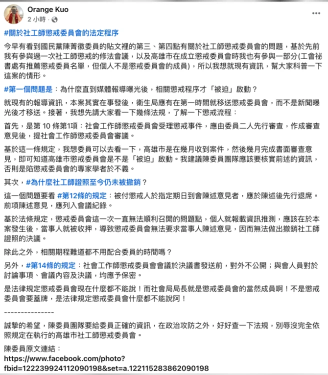 郭志南在貼文最後強調,希望陳委員團隊要給委員正確的資訊,在政治攻防之外,好好查一下法規,「別辱罵完全依照規定在執行的高雄市社工師懲戒委員會!」
