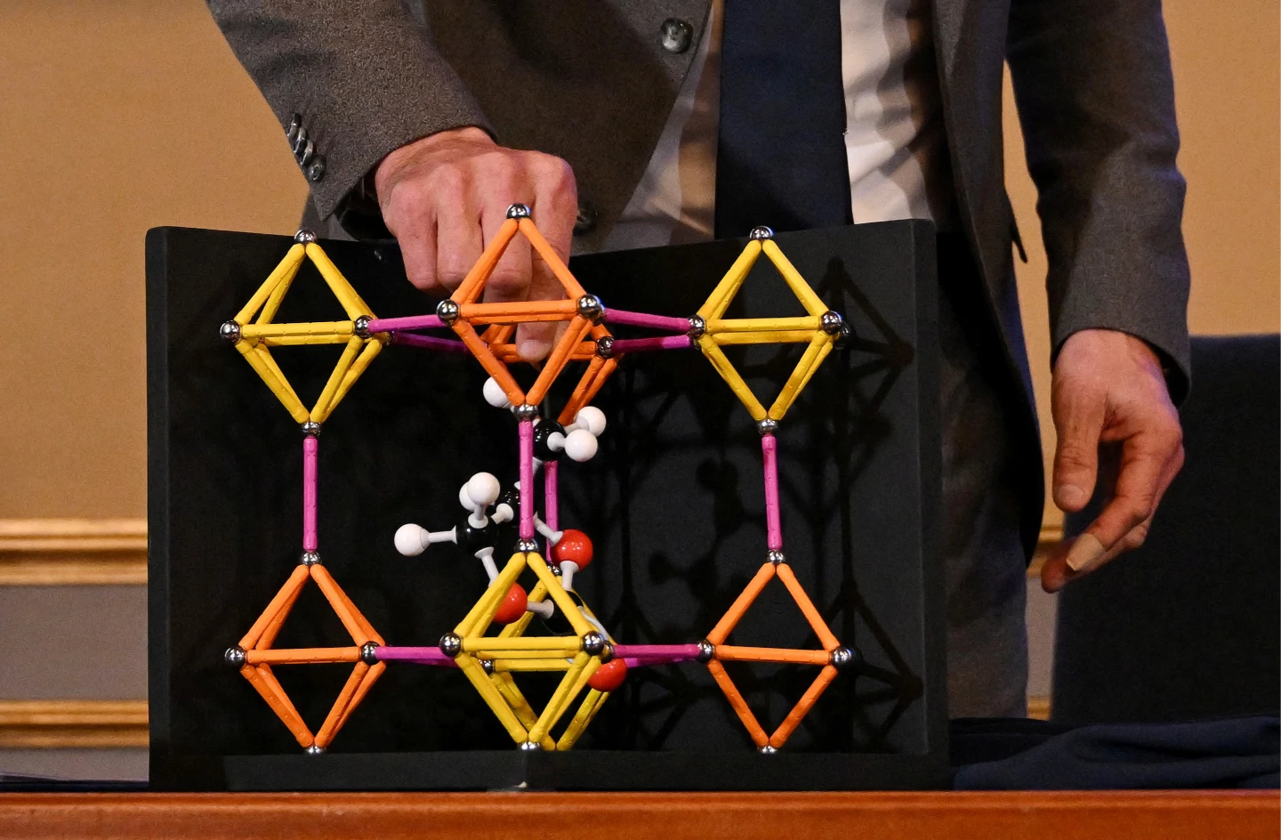 根據美國有線電視新聞網(CNN)報導,諾貝爾化學獎委員會主席林克(Heiner Linke)10月8日在宣布獲獎結果時指出,今年3名得主找到了製造全新材料的方法,這些材料內部「擁有巨大的孔洞」,功能「就像飯店的房間一樣,客人的分子可以進出同一材料」。