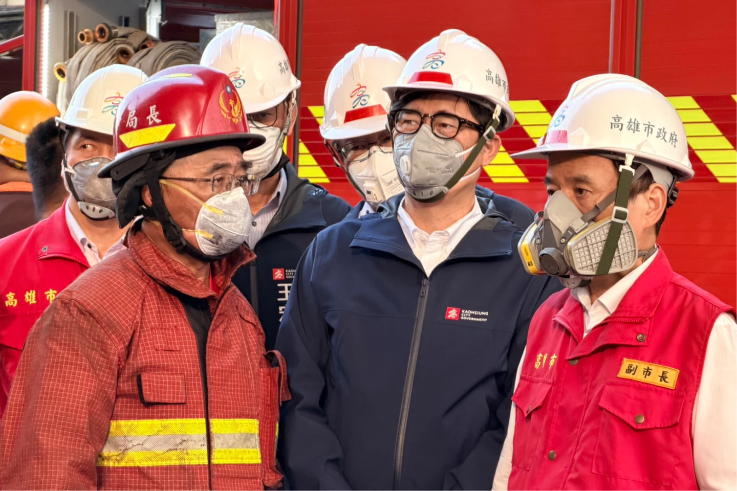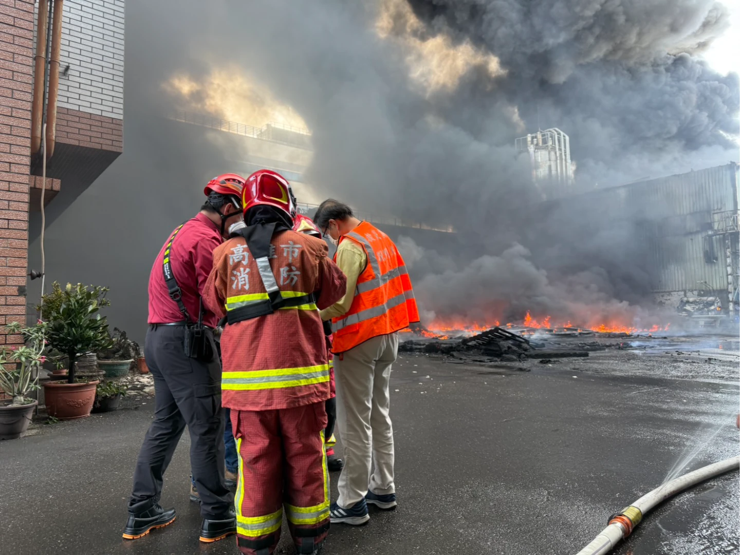 大發工業區某塑膠工廠今日上午11時許發生火警後,高雄市長陳其邁率市府團隊視察,坐鎮現場指示全力搶救。