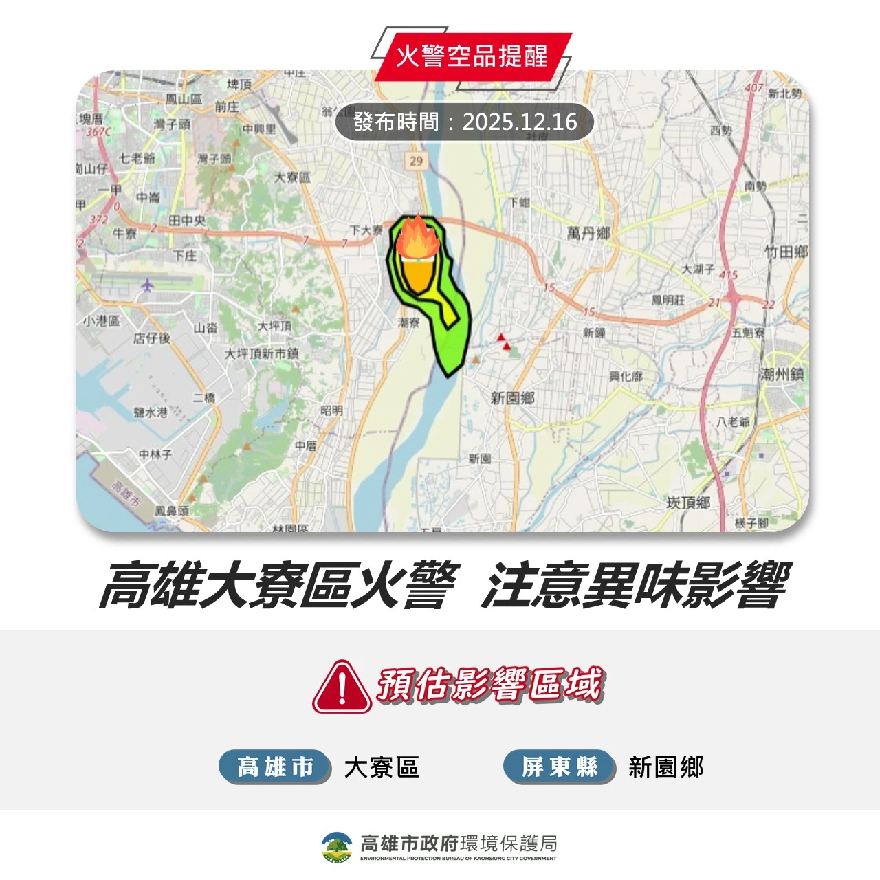 高雄市長陳其邁也在臉書警示,高雄大寮區發生火警,目前風向為偏西北風,導引污染物往東南傳遞, 目前火警系統顯示消防單位已到達,周邊居民如感異味請留意並適時關閉門窗,並透露空氣品質受影響區域為高雄市大寮區、屏東縣新園鄉,陳其邁提醒市民盡量待在室內,緊閉門窗、減少外出,如需外出請戴好口罩。