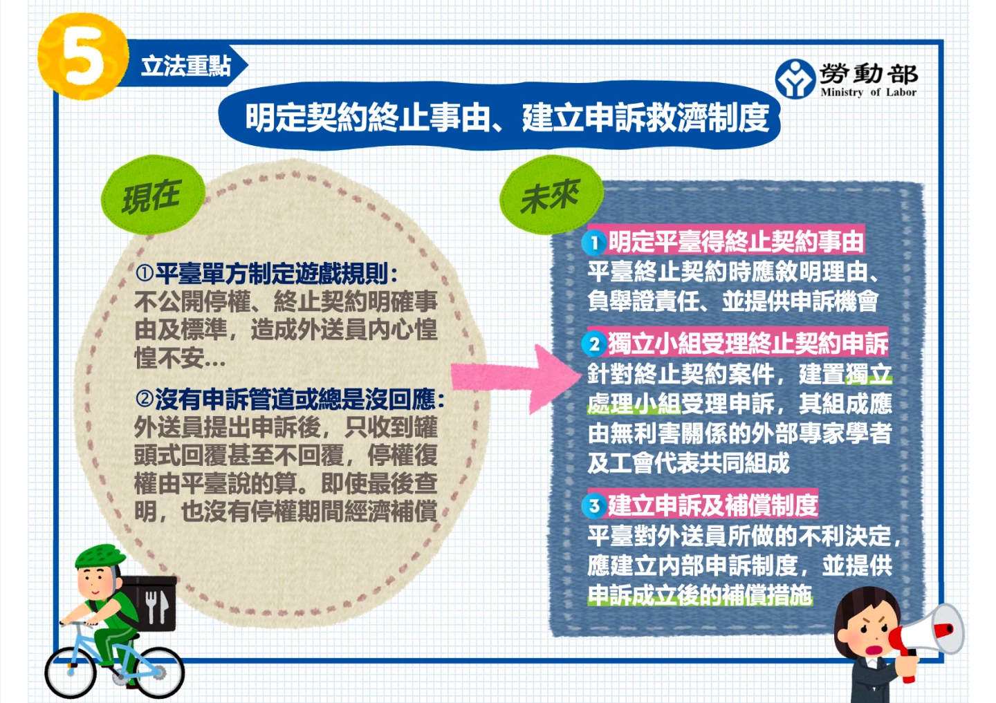 此外,王厚偉指出,目前外送平台停權、終止契約的事由及標準較不明確,且外送員申訴後,常常收到罐頭回覆,即使最後查明、不再停權,也不會有補償,因此草案中規定,平台終止契約時要敘明理由、負舉證責任,並有申訴機會,草案中也要求平台設立獨立處理小組,由客觀中立的第三方小組處理外送員對停權等懲處的申訴,避免平台球員兼裁判。