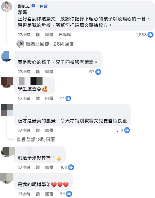 網友大讚:「善良的孩子,一生優秀」、「明道學生好棒」、「很感動的善舉,年輕人好棒!」、「同樣一隻腳,左腳跟右腳,左腳助人善,右腳踹人飛,這就是教育」、「不欲人知的善意和貼心,最令人感動」、「我也是一位高齡下肢重殘以代步車出行,每月最少一次與老同學聚會,去年有一次下捷運車輪卡在上下車縫隙中經多位乘客幫忙抬出,感謝默默幫我的好心人」。主播鄭凱云還留言說:「正好看到你這篇文,感謝你記錄下暖心的孩子以及暖心的一幕。明道是我的母校,我幫你把這篇文轉給校方」。