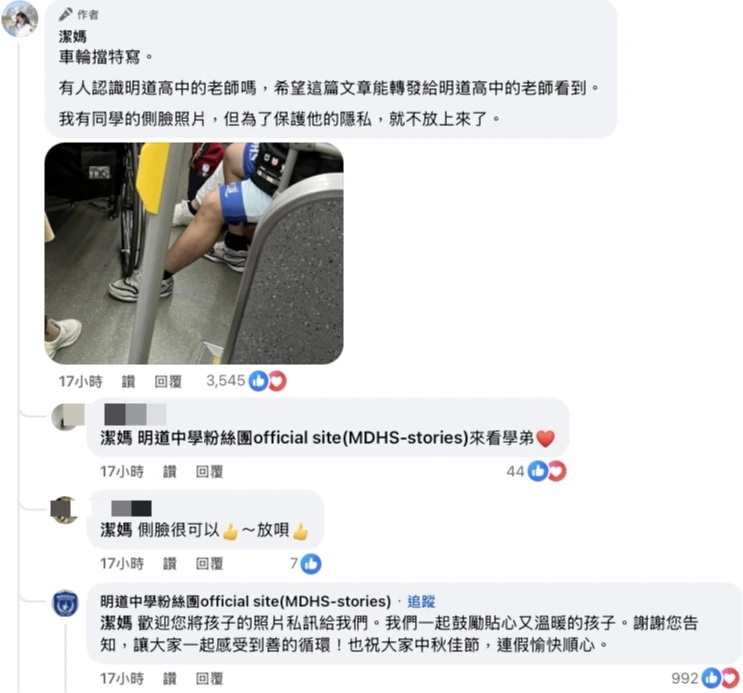 她在文章留言處補充問說,有人認識明道高中的老師嗎?希望這篇文章能轉發給明道高中的老師看到,雖然她有這名學生的側臉照片,但為了保護他的隱私,就不放上來了。而明道高中臉書粉專得知此事後,特地到該篇文章下方回應:「歡迎您將孩子的照片私訊給我們。我們一起鼓勵貼心又溫暖的孩子。謝謝您告知,讓大家一起感受到善的循環!也祝大家中秋佳節,連假愉快順心。」