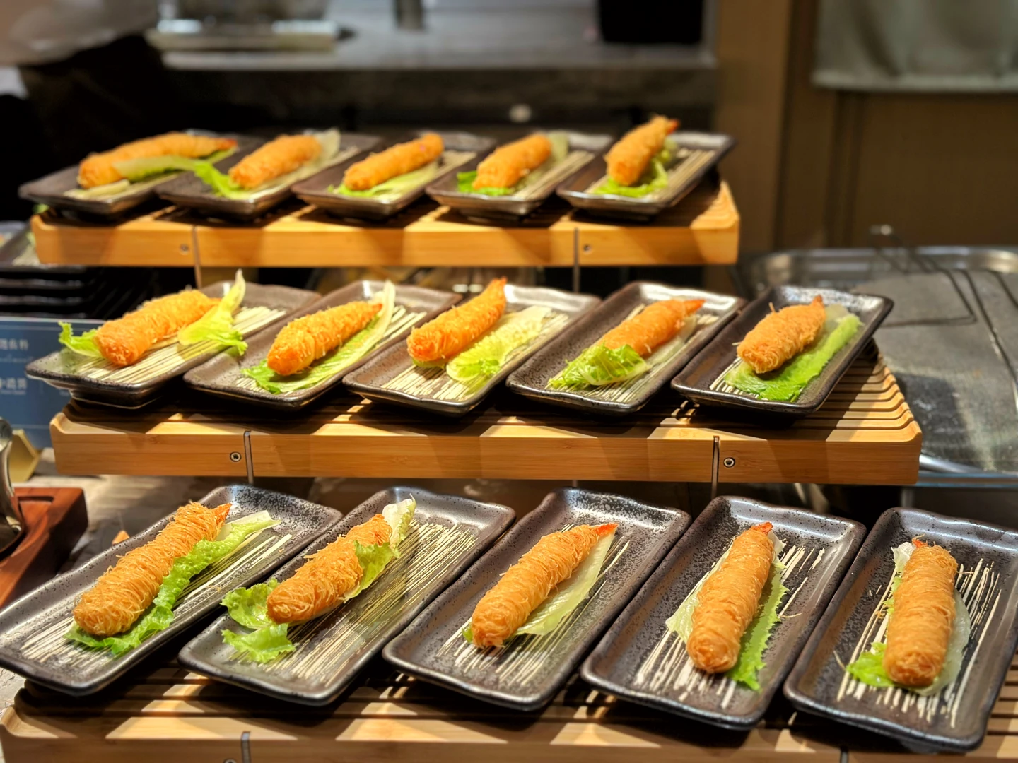 現炸天婦羅的「極區」,設置了4個板前座位,坐在此專區,可以欣賞到專業廚師現場演釋,除了必吃的蘿蔓雪絲揚、竹炭炸蝦、炸鮑魚,更全新推出「古早味八寶卷、花枝丸、花枝蝦仁油條」等炸物點心。