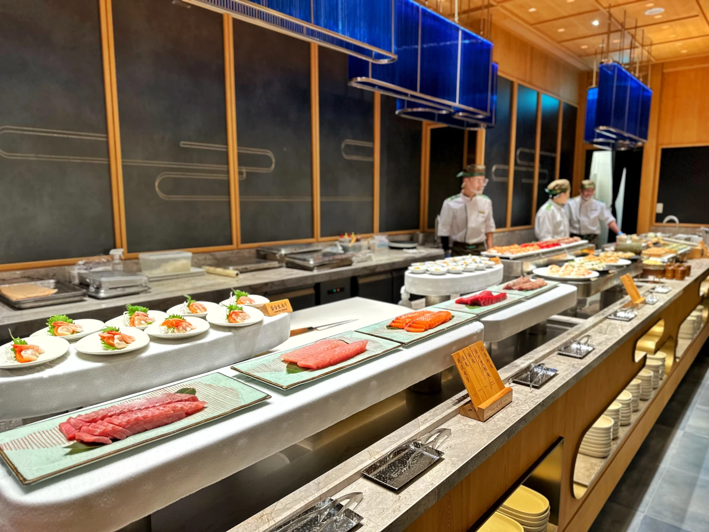 「盛區」供應日式料理,包含現點現做炙燒握壽司,和牛、干貝、比目魚、赤蝦、星鰻通通有,手捲則有干貝海膽、蘆筍、鮭魚卵、酪梨海老、甜蝦明太子,及每日自台東成功漁港直送的現流生魚片。