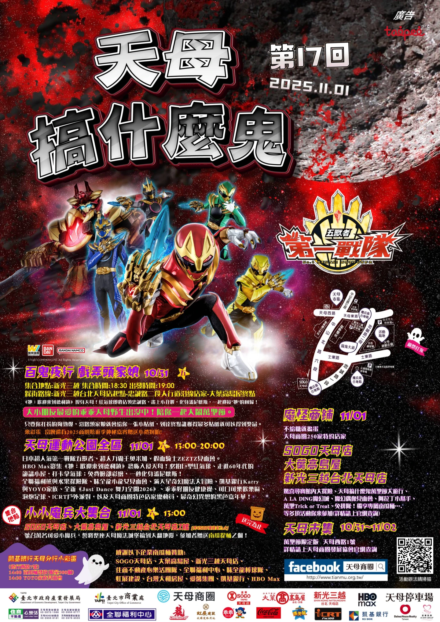 11/1(六)當天除了有《牠:歡迎來到德利鎮》恐怖入侵天母,現場更邀請深受小朋友喜愛動畫第一戰隊五獸者、超人力霸王奧米加、假面騎士ZEZTZ一同和大家見面。還有小朋友最愛的假面騎士ZEZTZ,BRICK PAPA樂高積木車,乖乖好朋友健康操、可口可樂歡樂區、味全龍遊戲活動,四方妖魔鬼怪齊聚忠誠路大鬧天母。