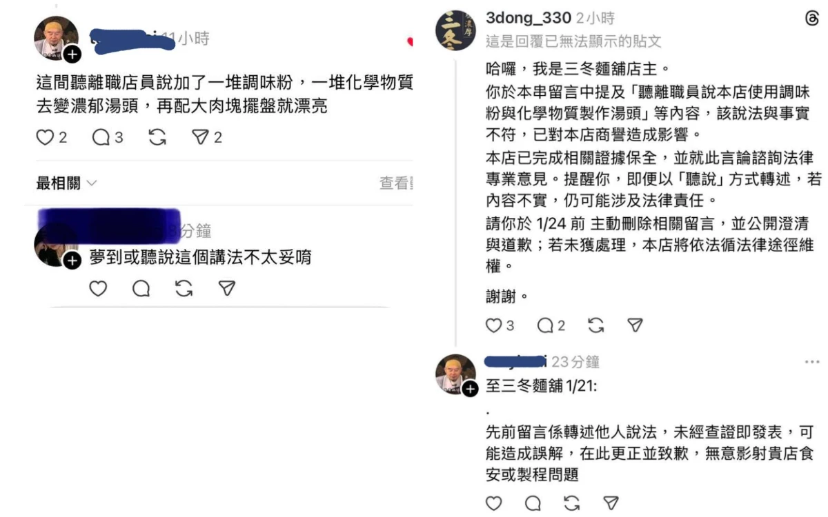 針對影射者已道歉,三冬麵舖表示,對方已道歉也關閉帳號了,一方面說是自己主觀認定,但又推卸責任給「聽說」,從去年就開始散佈不實,他們也不想與之糾纏,但損害已經造成,因此發文澄清。