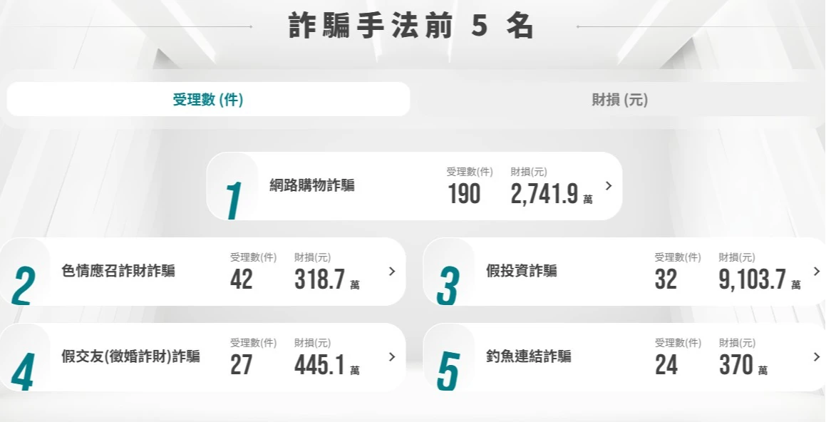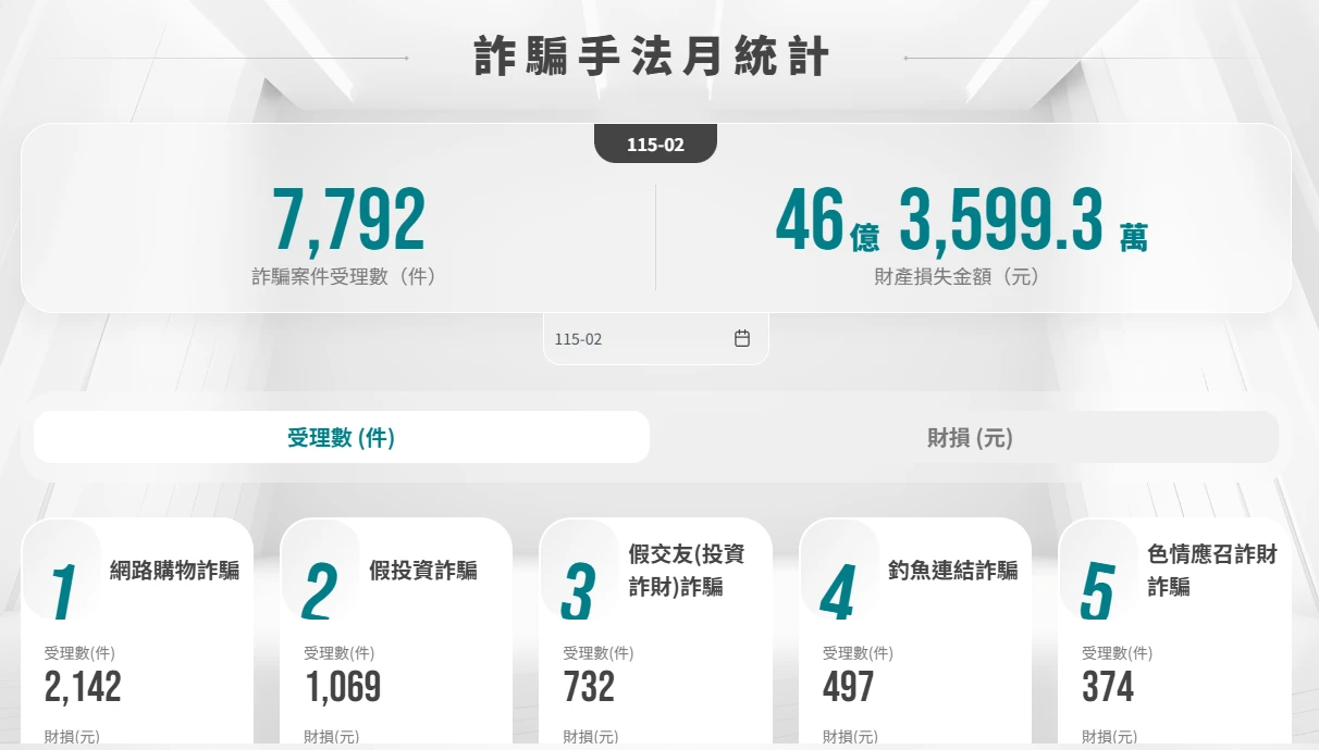 根據165打詐儀錶板統計以2月份受理詐欺案件數據,共受理7792件詐欺案件,損失金額達46億3599.3萬元。分析詐騙手法樣態,網路購物詐欺最多,受理案件達2142件、財損2億275.8萬,第二為假投資詐騙共計1069件、財損20億7121.8萬。第三是假交友(投資)詐騙共計732件、財損11億8697.9萬。第四則是釣魚連結詐騙共計497件、財損2265.4萬。第五則是色情應召詐財詐騙共計374件、財損8704.5萬。