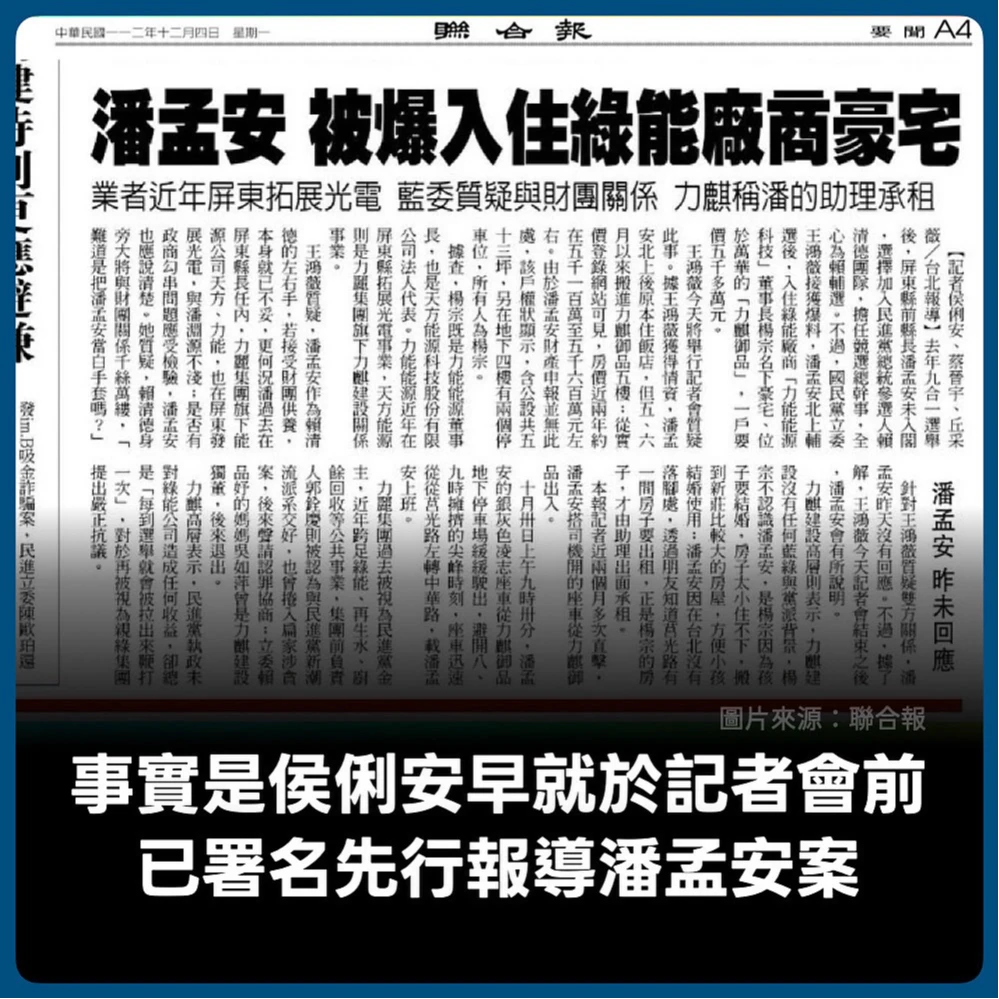 侯俐安昨晚發出聲明,最初收到爆料潘孟安台北住所消息,多方查證後,採訪到屋主回應潘有付租金,如實報導做好媒體平衡,但長官要求跟立委合作,另名長官更要以王鴻薇名義爆料,當時她強烈反對,但主管非常堅持。