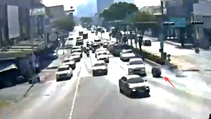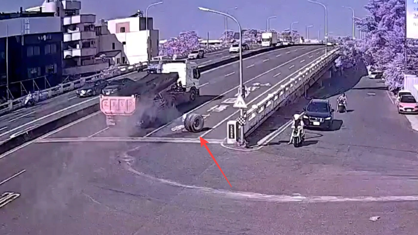 這起意外發生在今天中午11時許。據路口監視器畫面顯示,砂石車輪胎脫落後,巨輪從橋上滾下,藉著重力加速度一路爆衝揚起塵煙,聲勢浩蕩切過路口,正當滾向停等紅燈的車流時,所幸變換綠燈,好幾輛車加速及時閃過,但有輛轎車面對巨輪迎面進擊,急忙煞車退而可退,車頭慘遭重擊。