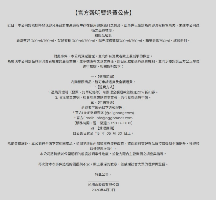 公司強調全面下架相關產品,並啟動內部稽核與流程改善,確保原料管理與品質控管機制全面提升,杜絕類似情況再次發生。