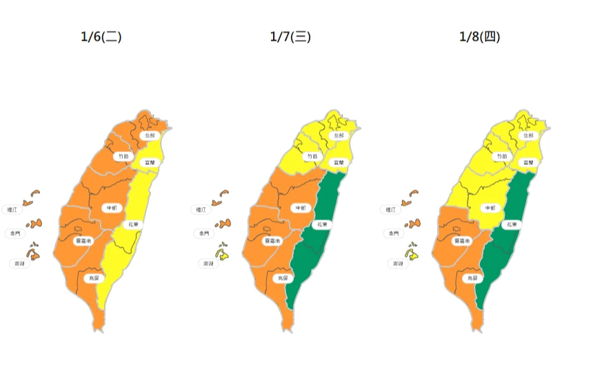 包括北部、竹苗、中部、雲嘉南、高屏及馬祖、金門、澎湖空品區為「橘色提醒」等級,僅東半部的宜蘭及花東空品為「普通」等級。