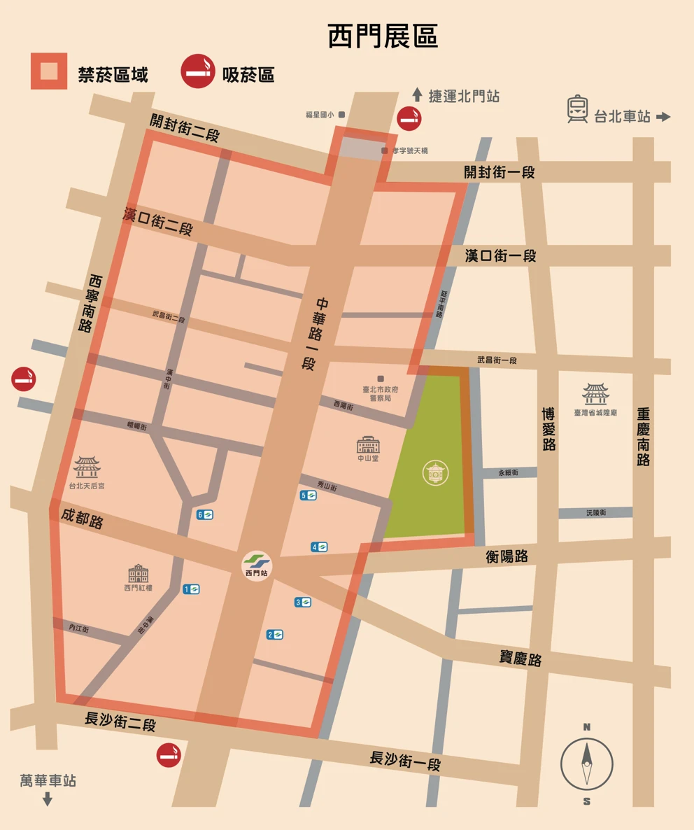 觀傳局表示,2026台北燈節「西門展區」禁菸範圍為開封街以南、長沙街以北、西臨西寧南路、東至延平南路所圍之區域,含中山堂廣場之人行通道及騎樓,以及孝字號天橋上方路面。「花博展區」的禁菸範圍則是花博公園圓山園區及周邊場域,東側至中山北路3段、南側至民族西路,西側含捷運圓山站1號出口往南至線形公園、捷運圓山站2號出口往北至庫倫街口、北側至草坪休憩區所圍區域,並均含人行通道。