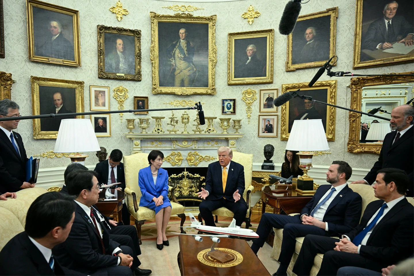 高市早苗顯然並沒有把這當成笑話,而是瞪大眼睛、深吸一口氣,瞥了一眼坐在橢圓形辦公室一旁的顧問團。