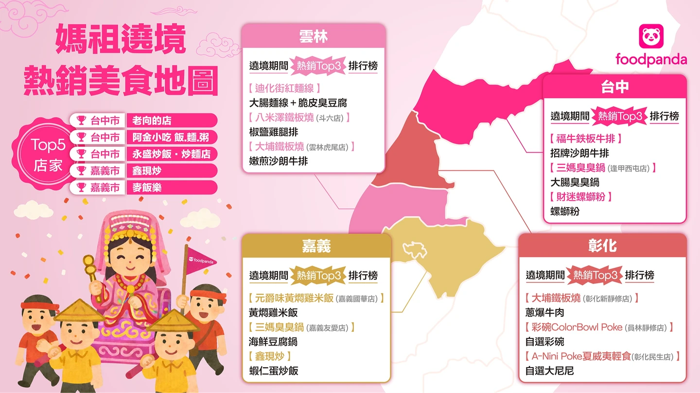 【記者劉沛妘/台北報導】苗栗白沙屯拱天宮媽祖徒步進香於今(12)日深夜11時55分起駕,展開為期8天7夜、往返約400公里的年度宗教盛事。為跟上「粉紅超跑」白沙屯媽祖高速且不定的行蹤,信眾發展出追求效率、單手即食的「一口吃」補給商機,也間接帶動美食外送買氣。對此,foodpanda指出,以炸物店為例,根據2025年進香期間數據顯示,「脆皮花枝丸」銷售額就飆漲11倍!媽祖遶境限定、4月外送優惠碼一次看。