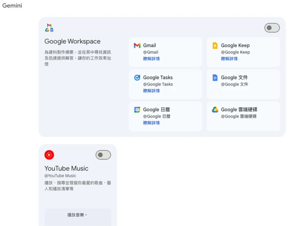 Google在Gemini系列應用程式說明中指出,支援個人化智慧服務的Google應用程式,包括Gmail和雲端硬碟裡的內容、Google相簿裡的相片和影片、Google搜尋以及YouTube記錄。