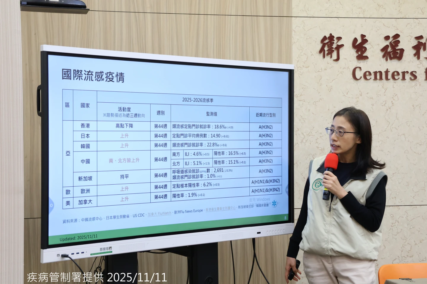 不過,疾管署發言人曾淑慧提醒,日本、韓國流感疫情呈上升趨勢,中國近期活動度及陽性率皆上升,主要流行型別為A(H3N2),北歐、中美洲及加勒比地區近期活動度及陽性率亦皆上升,主要流行型別為A(H1N1)及A(H3N2),旅遊旺季牽動國內疫情,預估國內今年第二波流感疫情將於12月上旬明顯升溫。