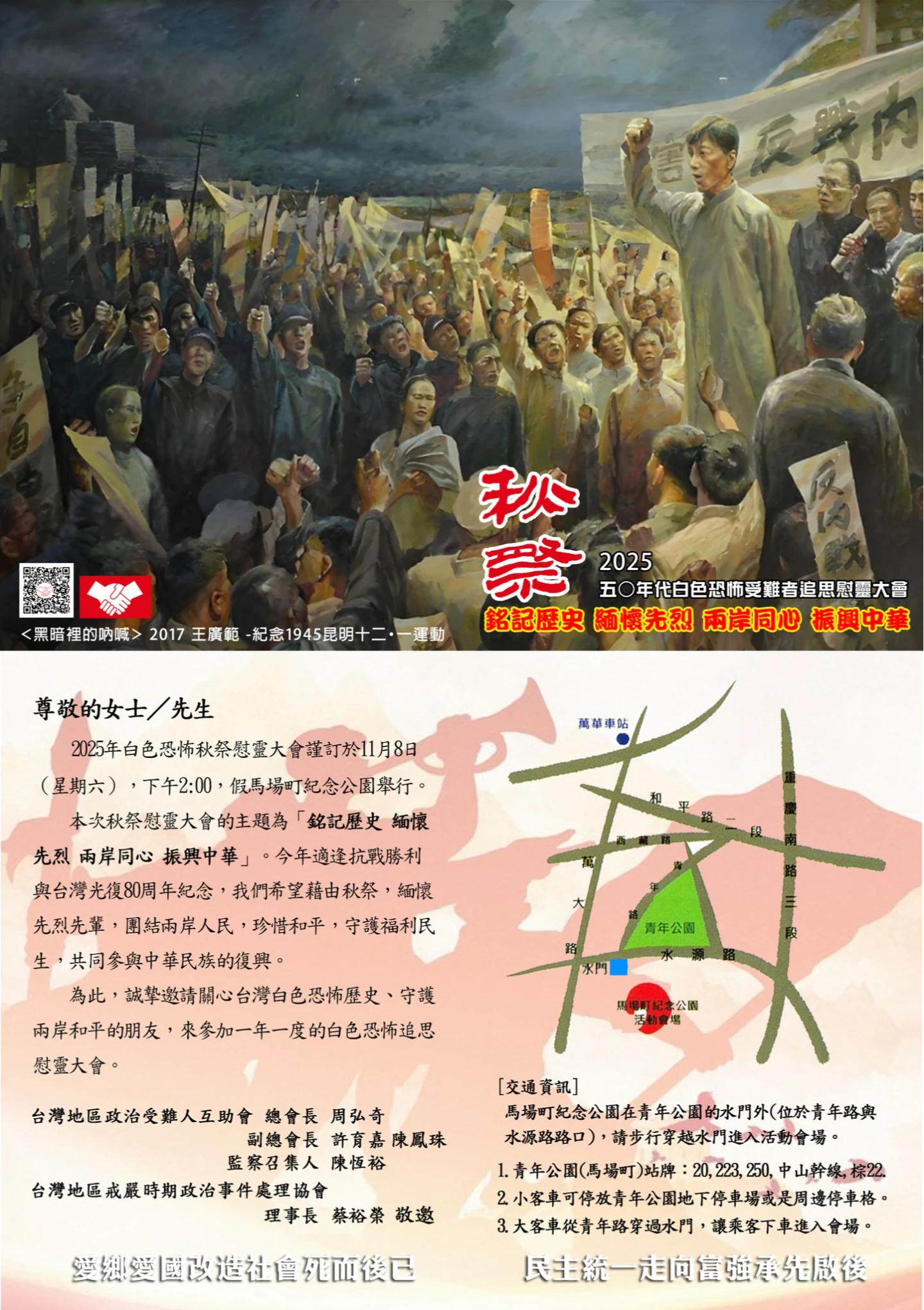 台灣地區政治受難者互助會明下午2時在馬場町公園舉行「五○年代白色恐怖秋祭追思慰靈大會」,根據採訪通知,主要追思對象,是1950年所破獲中共安插在國府內最高階共諜將官吳石,後來遭查獲並判死刑,無石還被中國大陸封為「烈士」。
