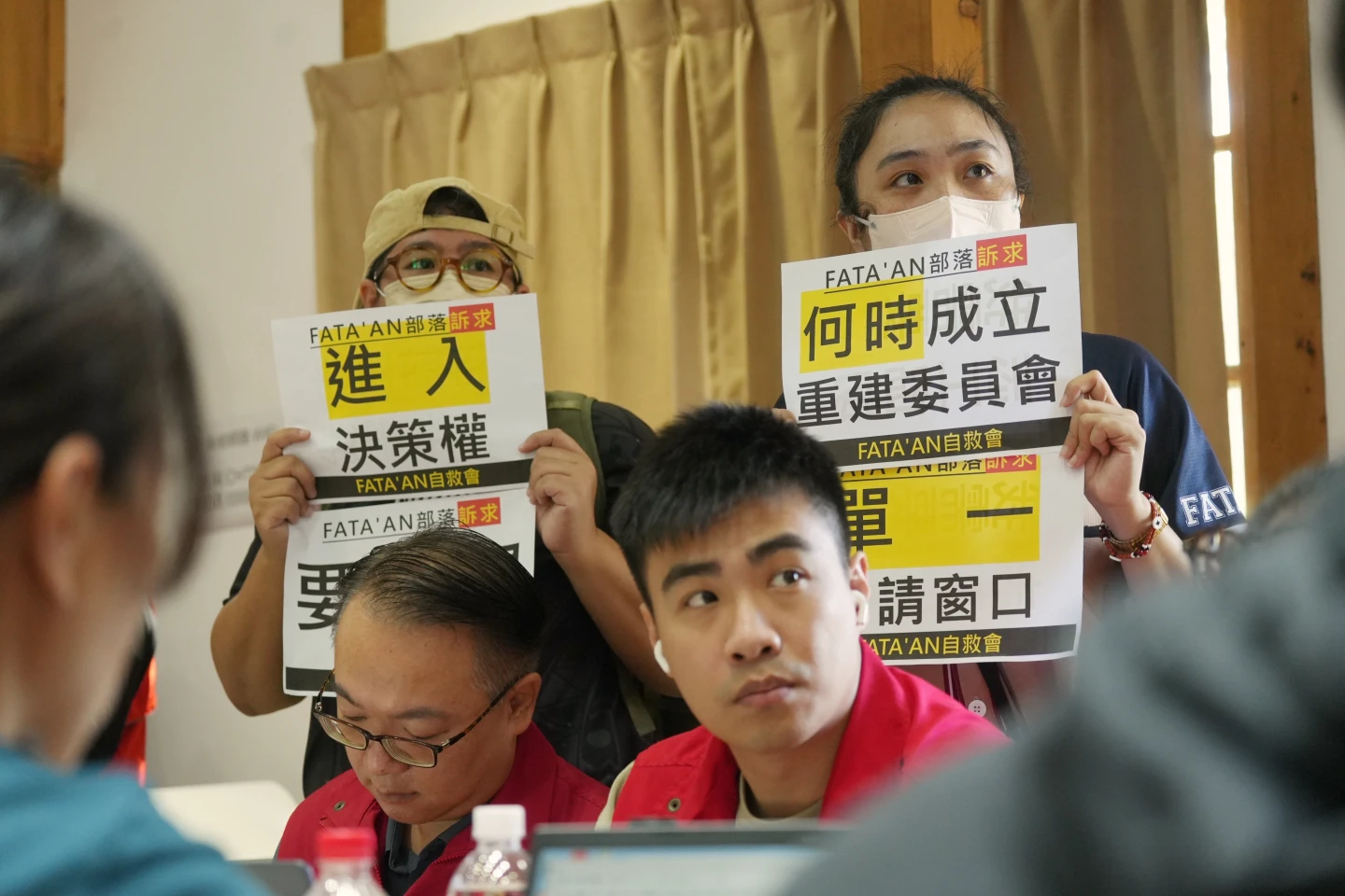 Fata’an部落自救會成員手持寫有標語的手舉牌進入會場,訴求部落族人要有決策權、成立重建委員會,還有設立單一窗口等。