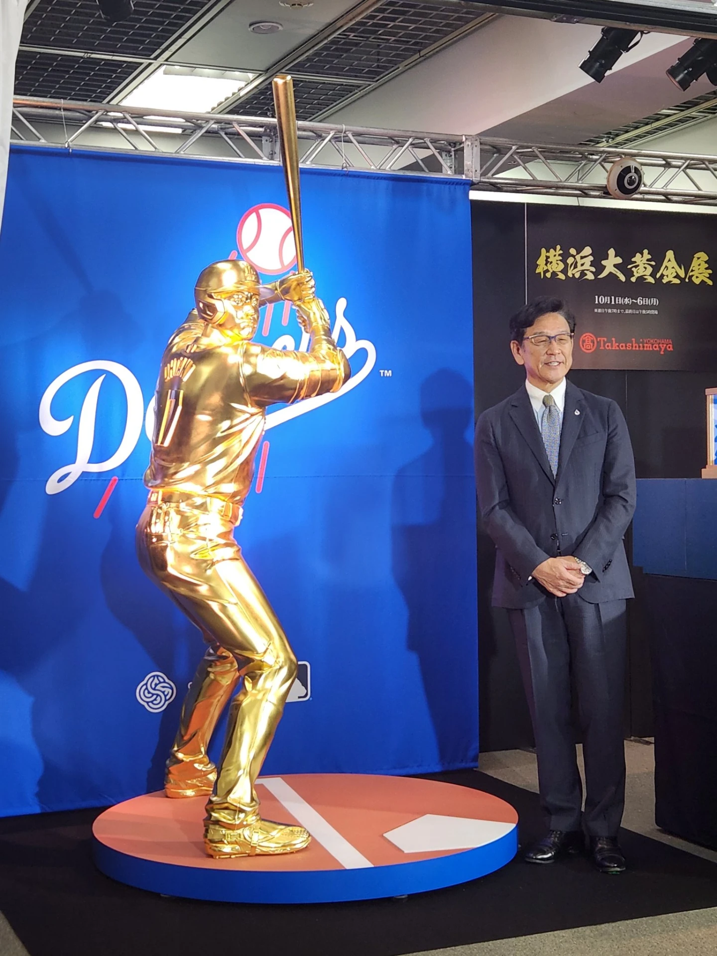 展覽開幕當天,還邀請到大谷翔平在日本火腿時期的恩師栗山英樹,為大谷翔平的金身雕像揭幕,看到大谷翔平金光閃閃的雕像後,栗山英樹開玩笑說:「他真的變成金子了!」