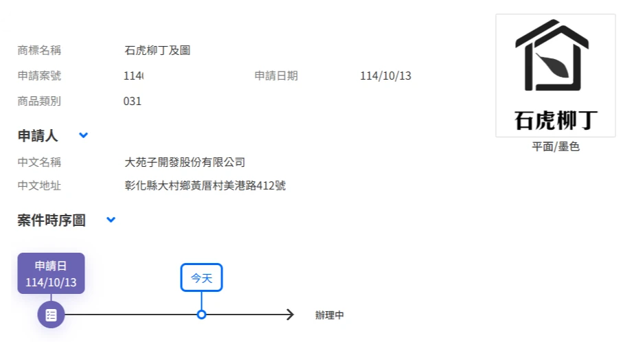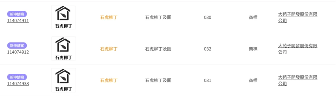 大苑子申請的圖案,在自家飲料店的LOGO下方加上「石虎柳丁」字樣,10月13日申請,目前仍在審理中。